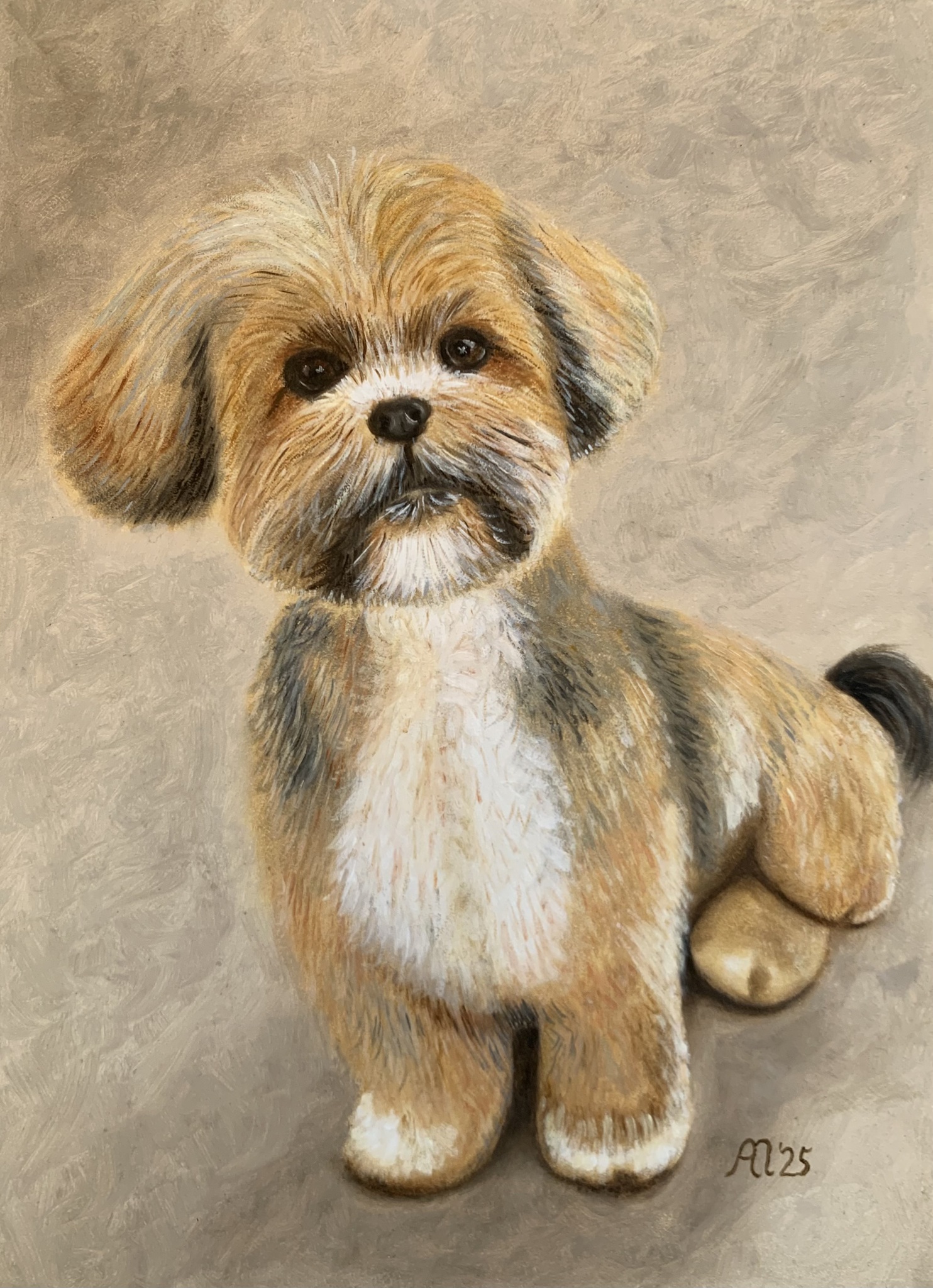 Een vertederend olieverfschilderij op MDF paneel (22 x 30 cm), dat een klein hondje met een lieve, nieuwsgierige uitdrukking toont. De zachte penseelstreken en warme kleuren brengen het pluizige karakter van het dier prachtig tot leven. De neutrale achtergrond laat de persoonlijkheid van het hondje echt spreken. Gesigneerd en gedateerd 2025.