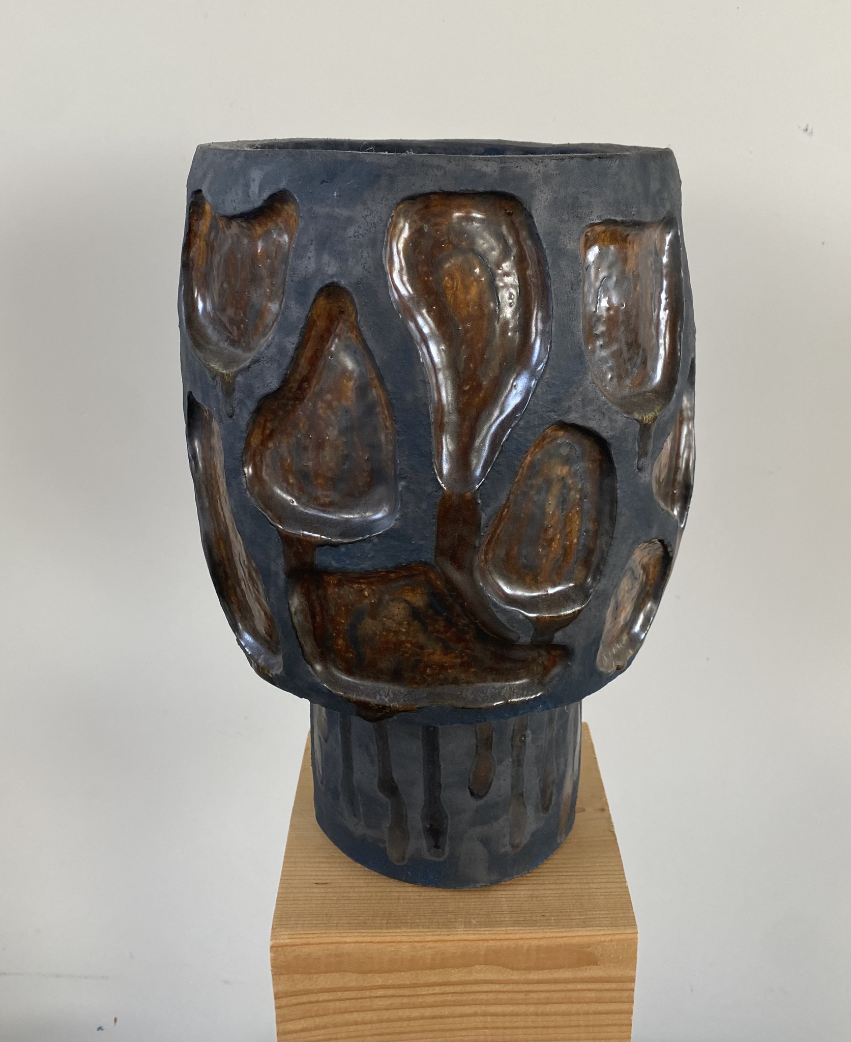 Stoer en robuust object siervaas cq pot. Van matte keramiek behandeld met antraciet engobe en met verdiepte geglazuurde vlakken.