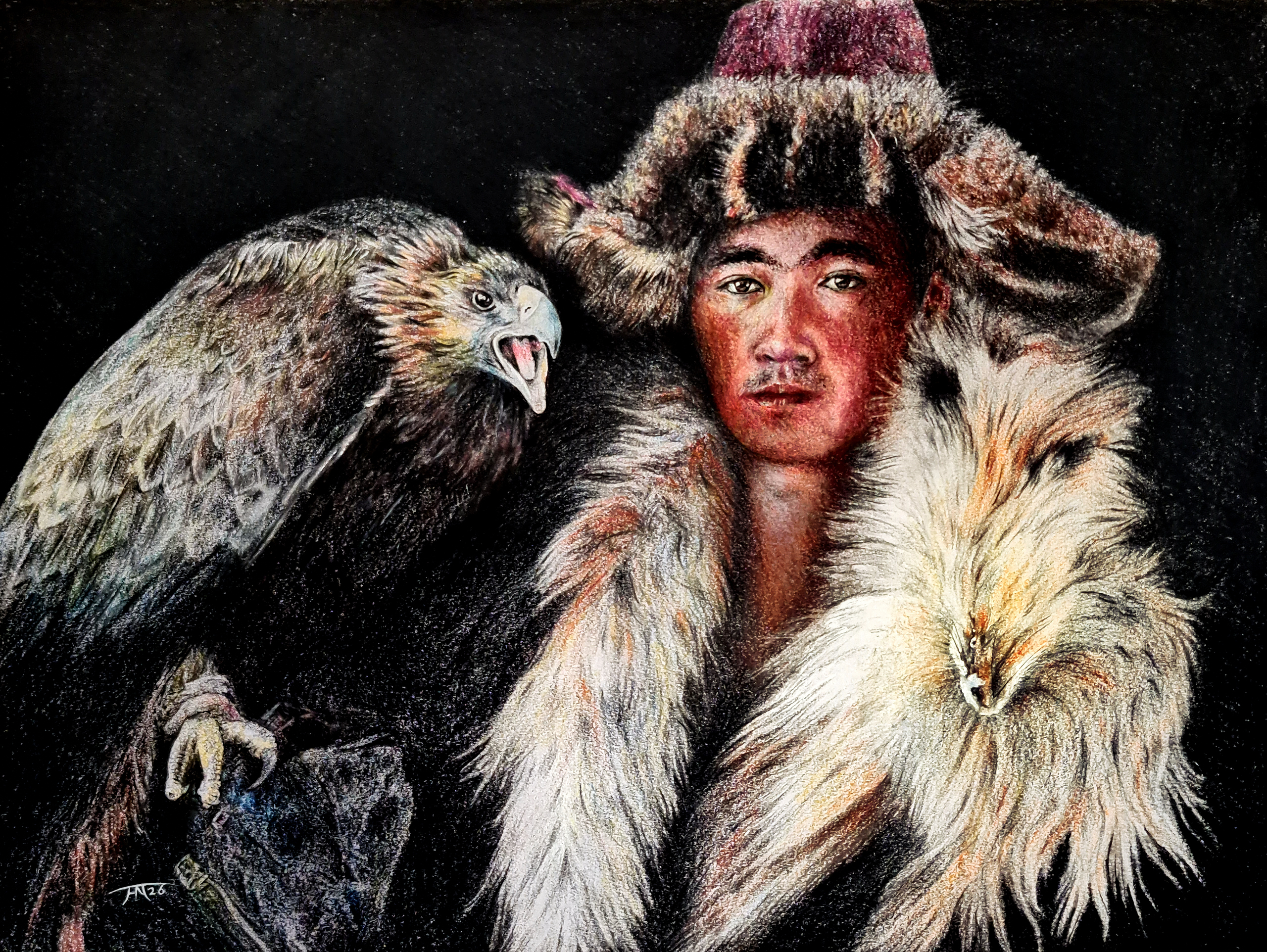 In de provincie Bayan Ölgii van Mongolië leven de geïsoleerde Kazachse adelaar jagers. Zij overleven extreem koude lange winters en zeer hete korte zomers. Ik maakte een serie pastel schilderijen van deze met uitsterven bedreigde mens types, geïnspireerd door de fotograaf Jimmy Nelson door zijn prachtige boek 'Before the pass away'.