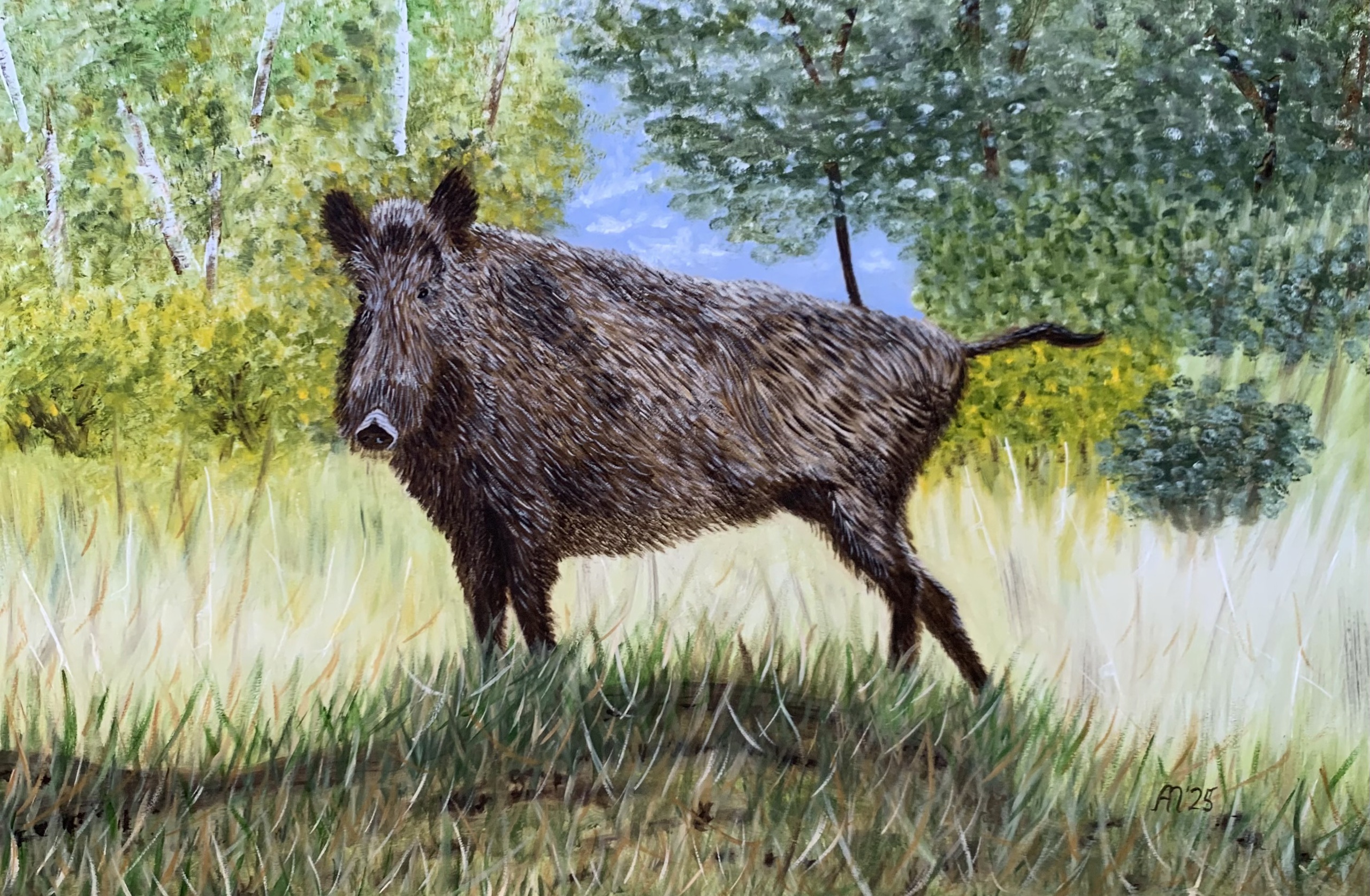 Een realistisch olieverfschilderij van een wild zwijn, alert in zijn natuurlijke habitat. De rijke texturen en het spel van licht tussen gras en gebladerte brengen het bos tot leven.