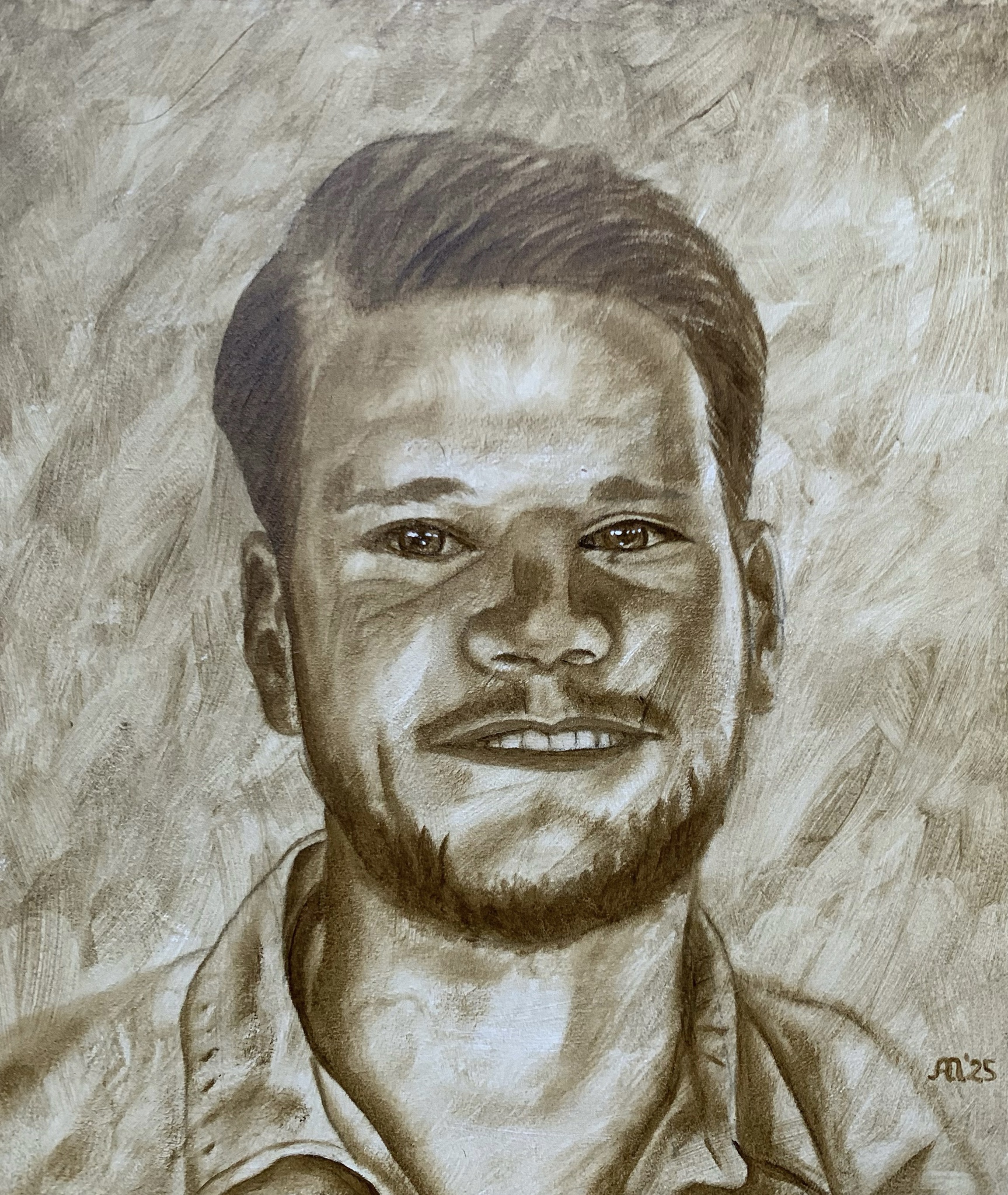 Portret van jongeman geschilderd met 1 teint olieverf op MDF paneel.