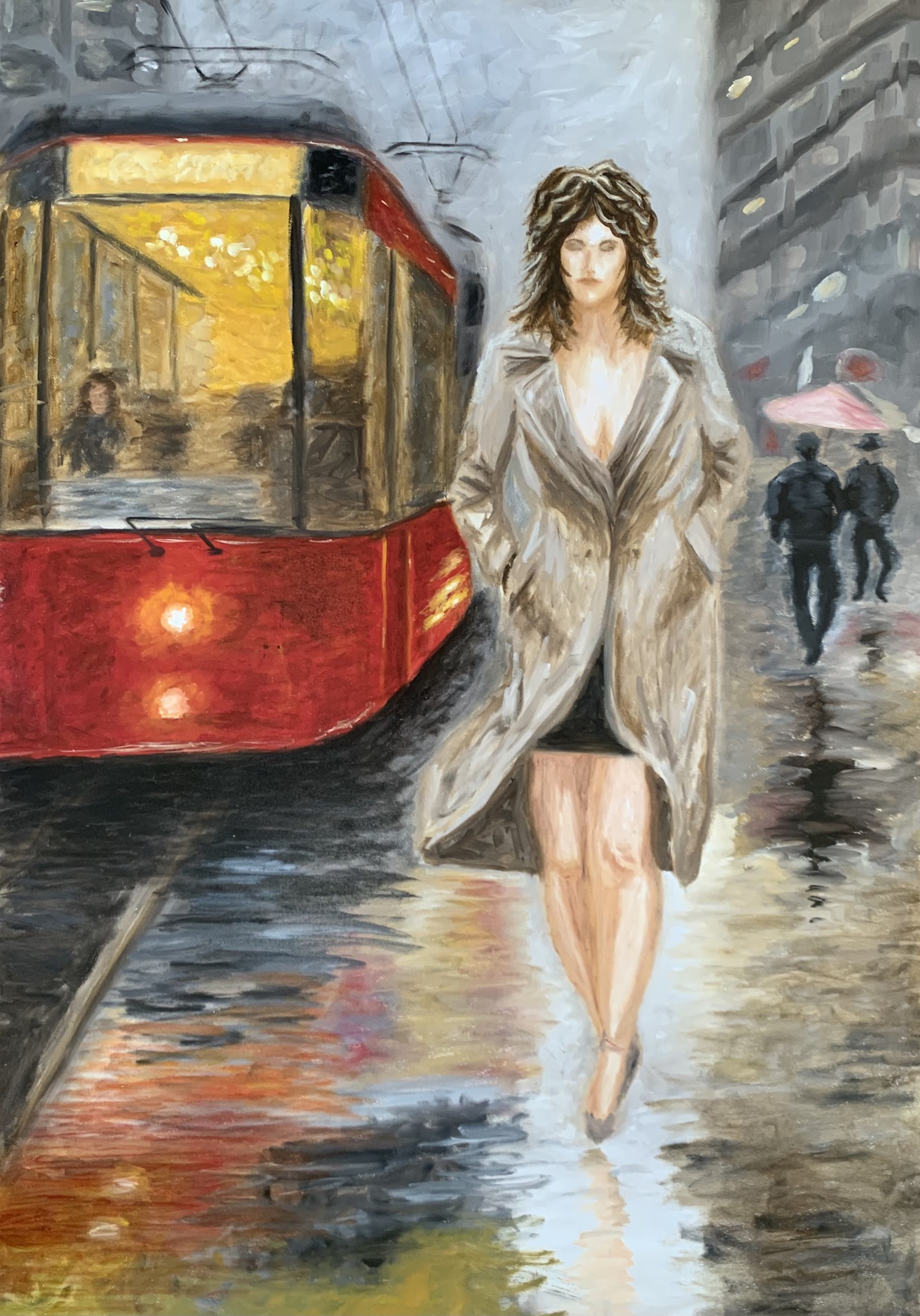 Dit expressieve olieverfschilderij toont een krachtig stadsbeeld op een regenachtige avond. Een jonge vrouw loopt zelfverzekerd over de natgeregende straat, haar lichte jas wapperend in de wind, terwijl haar reflectie glinstert in de glanzende stoeptegels. Op de achtergrond rijdt een felrode tram, waarvan de warme binnenverlichting contrasteert met de kille, grijze tinten van de omringende gebouwen. De impressionistische penseelstreken en het spel van licht en weerspiegelingen vangen perfect de sfeer van een levendige maar enigszins melancholische stad.