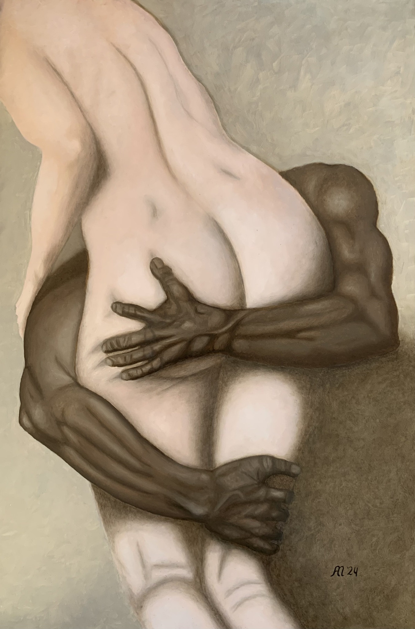 Dit krachtige olieverfschilderij op MDF paneel, toont een intieme en expressieve omhelzing tussen twee lichamen met contrasterende huidskleuren. De donkere armen omsluiten teder het lichte lichaam, wat niet alleen een fysieke maar ook emotionele verbinding verbeeldt. De gespierde vormen en de vloeiende lijnen benadrukken zowel kracht als kwetsbaarheid, terwijl het spel van licht en schaduw diepte en dynamiek toevoegt. Het werk nodigt uit tot reflectie over verbondenheid, intimiteit en de schoonheid van diversiteit.