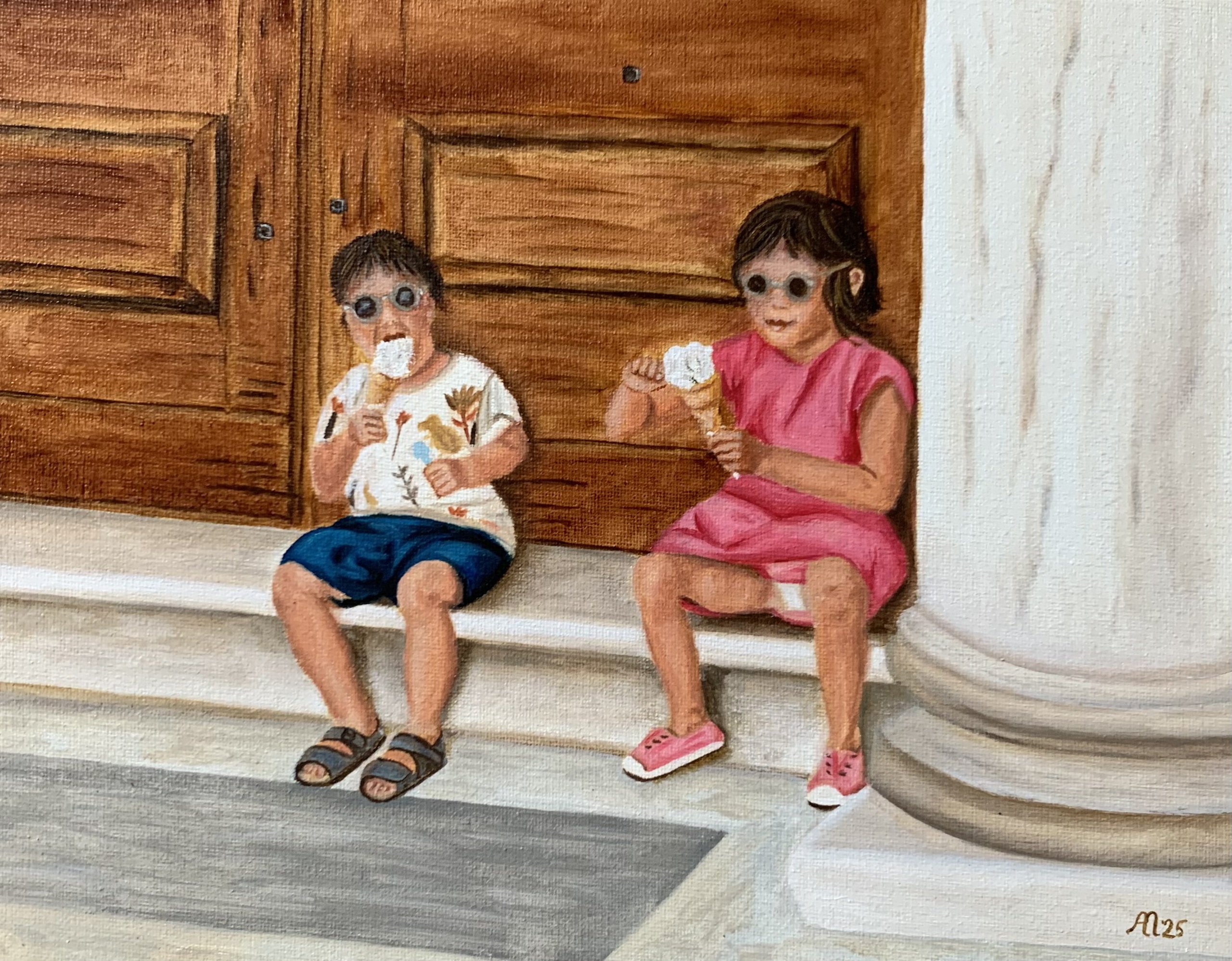 Twee jonge kinderen genieten op een warme zomerdag van hun ijsje, zittend op een koele marmeren stoep voor een imposante houten deur in Pisa. Hun onbezorgde houding, de smeltende ijsjes en hun charmante zonnebrillen brengen een sfeer van speelsheid en vakantiepret. Het contrast tussen de monumentale achtergrond en de speelse kleuters benadrukt de schoonheid van het alledaagse moment. De levendige kleuren en het lichtspel vangen de warmte van de Italiaanse zon en de kinderlijke vreugde van een simpel ijsje op een lange dag vol avontuur.