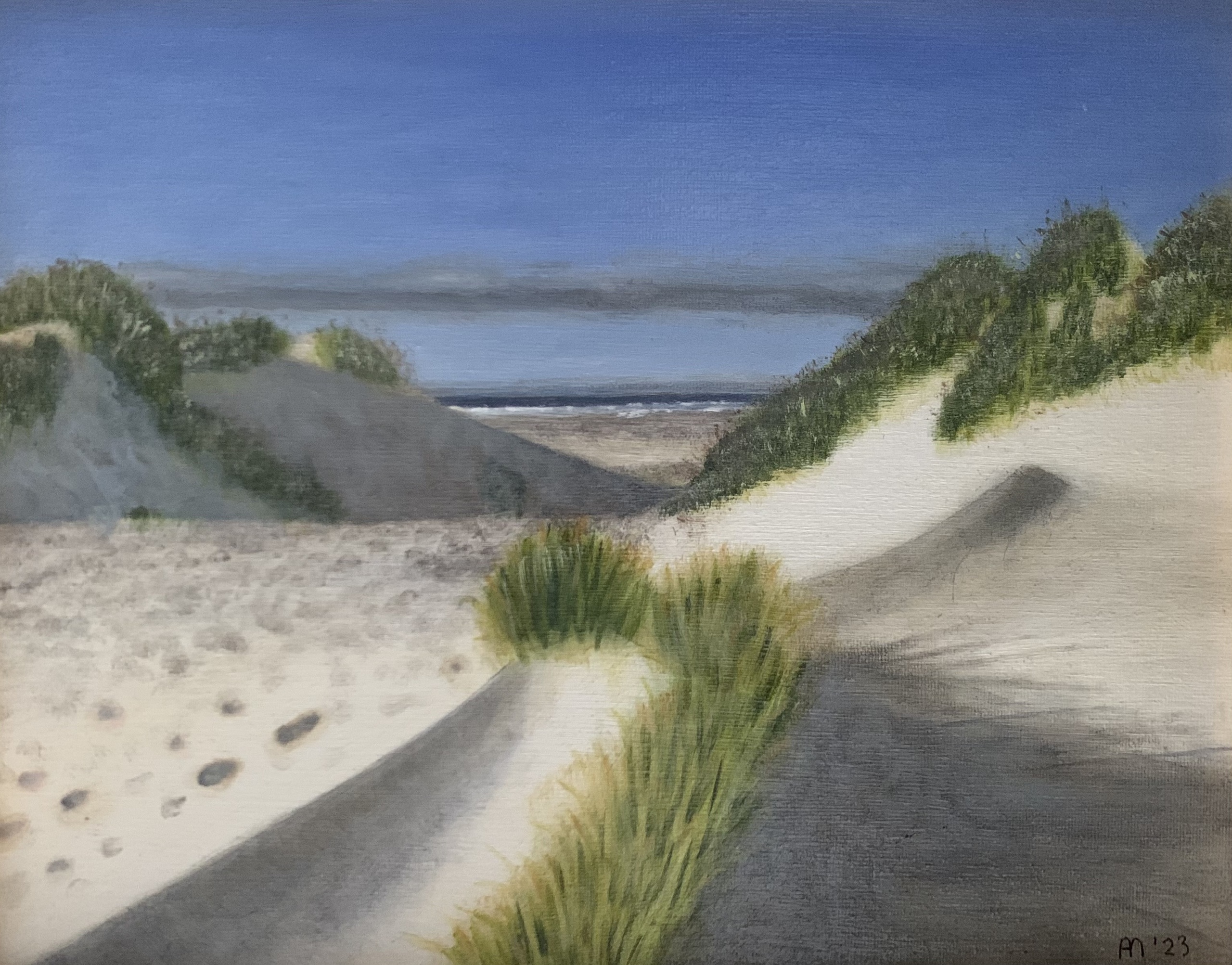 Dit olieverfschilderij op canvasboard (inclusief lijst 29 x 35 cm) vangt het serene en heldere karakter van de duinlandschappen op Vlieland. De compositie leidt de kijker via een zanderig pad door de duinen naar een glimp van de zee aan de horizon. Het spel van licht en schaduw op het zand en de weelderige begroeiing brengen het warme zomerlicht prachtig tot leven. De lucht is diepblauw, met lichte bewolking aan de horizon, wat de rust en uitgestrektheid van het Waddeneiland benadrukt. Het werk wordt omlijst door een natuurlijke houten lijst die het landschap complementeert.