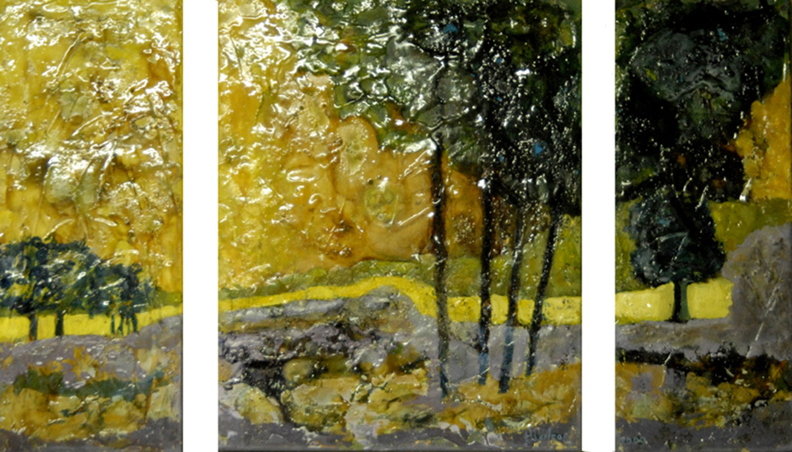 Met harsklompen en pigment op het doek gebrand: "fire painting"
