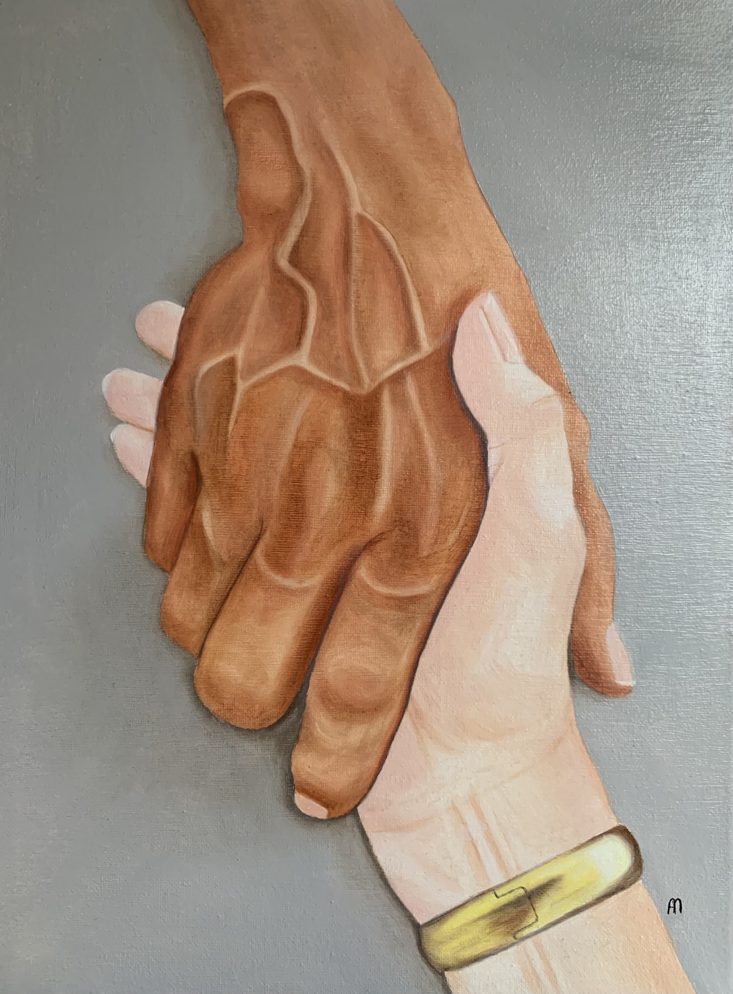 Een warme, donkere hand rust in de zachte aanraking van een lichte hand. De lijnen, aders en vormen zijn zichtbaar en eerlijk — zonder opsmuk, zonder masker. In dit moment wordt het verschil geen scheiding, maar juist de verbinding. Het schilderij ademt zachtheid, vertrouwen en het besef dat echte kracht schuilt in aanraking en menselijkheid.