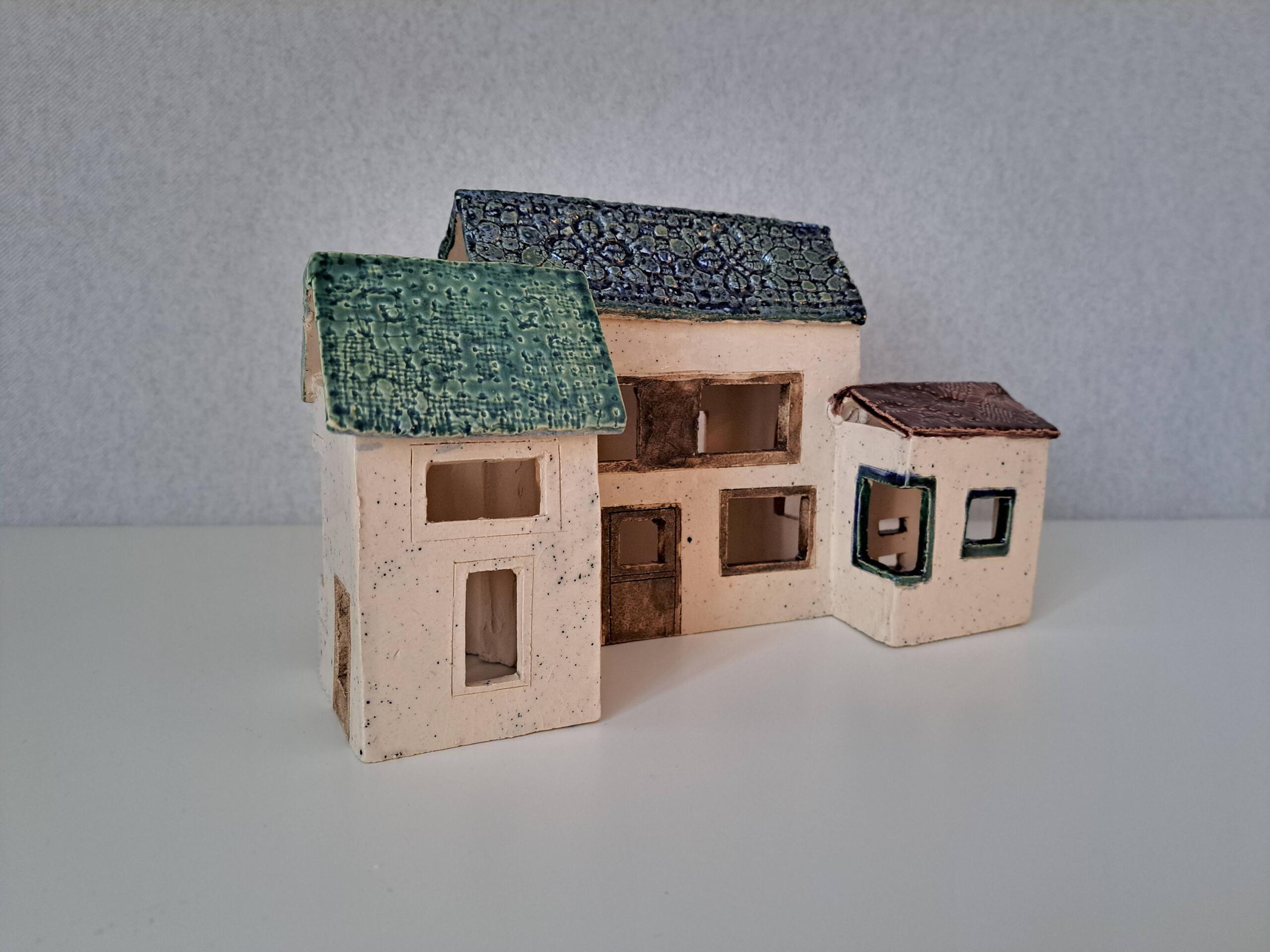 Drie huizen, geschakeld met creme gespikkelde wanden. Daken en kozijnen in verschillende kleuren. De daken hebben afdrukken van verschillende soorten kant.