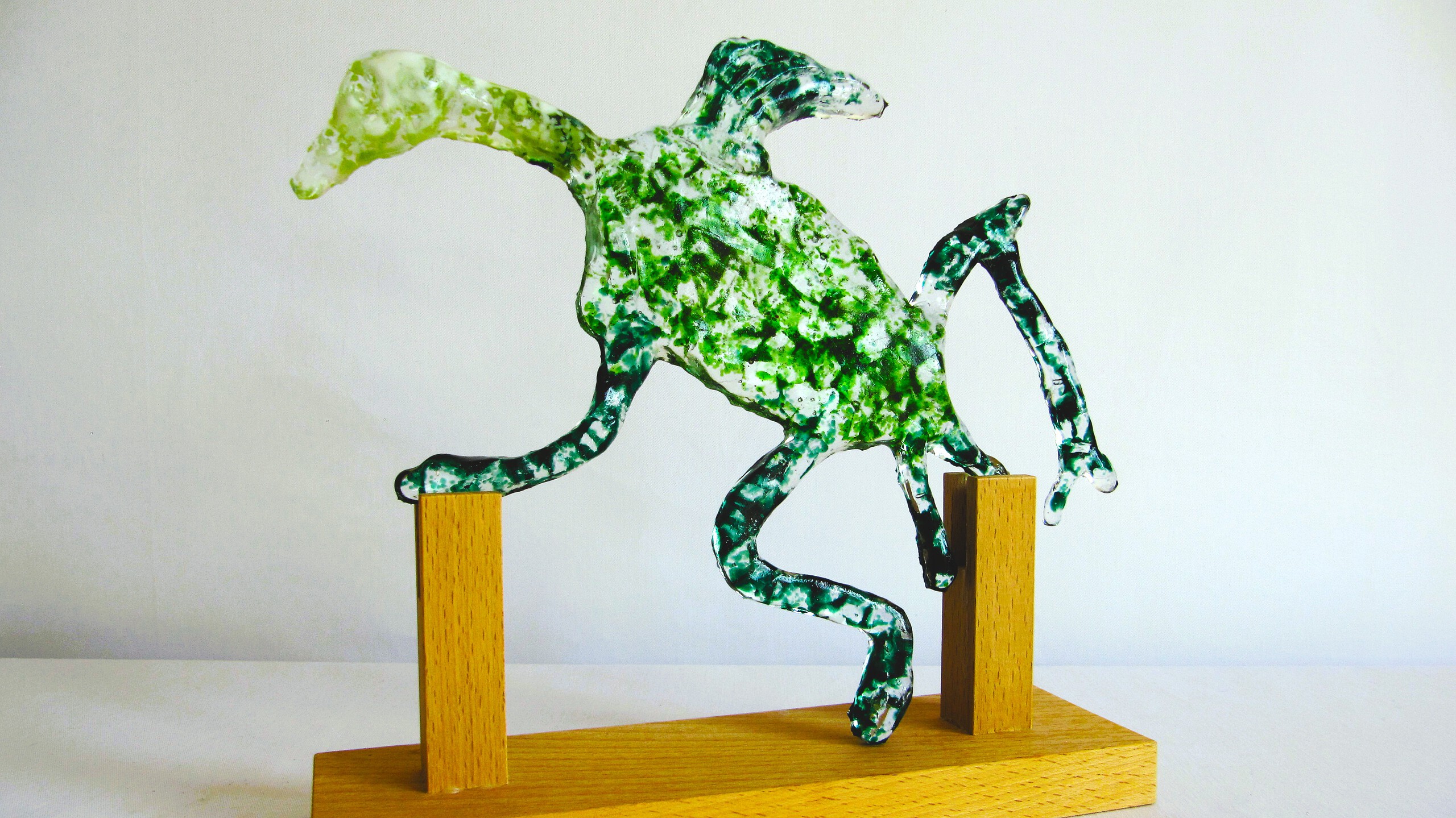 De groen gekleurde fossiel pad ligt plat op zijn buik. Stil en bevroren in beweging.