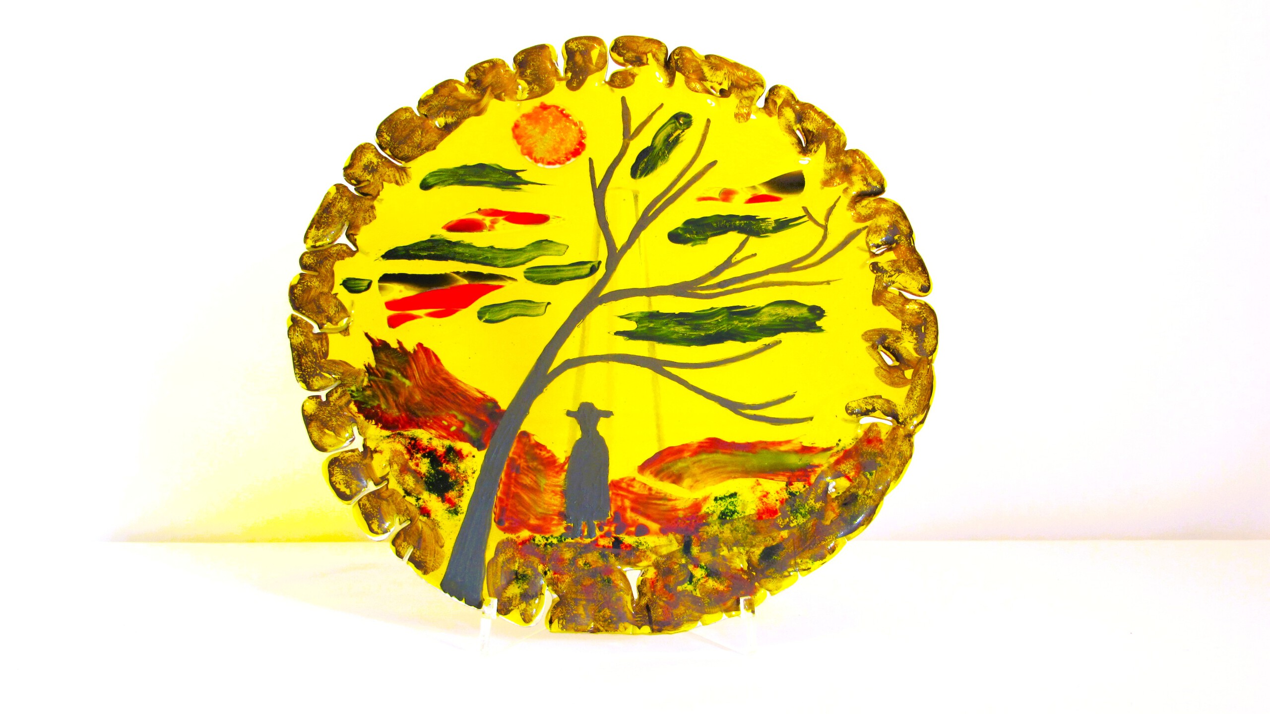 Wandeling in de natuur, gebrandschilderd tafereel.