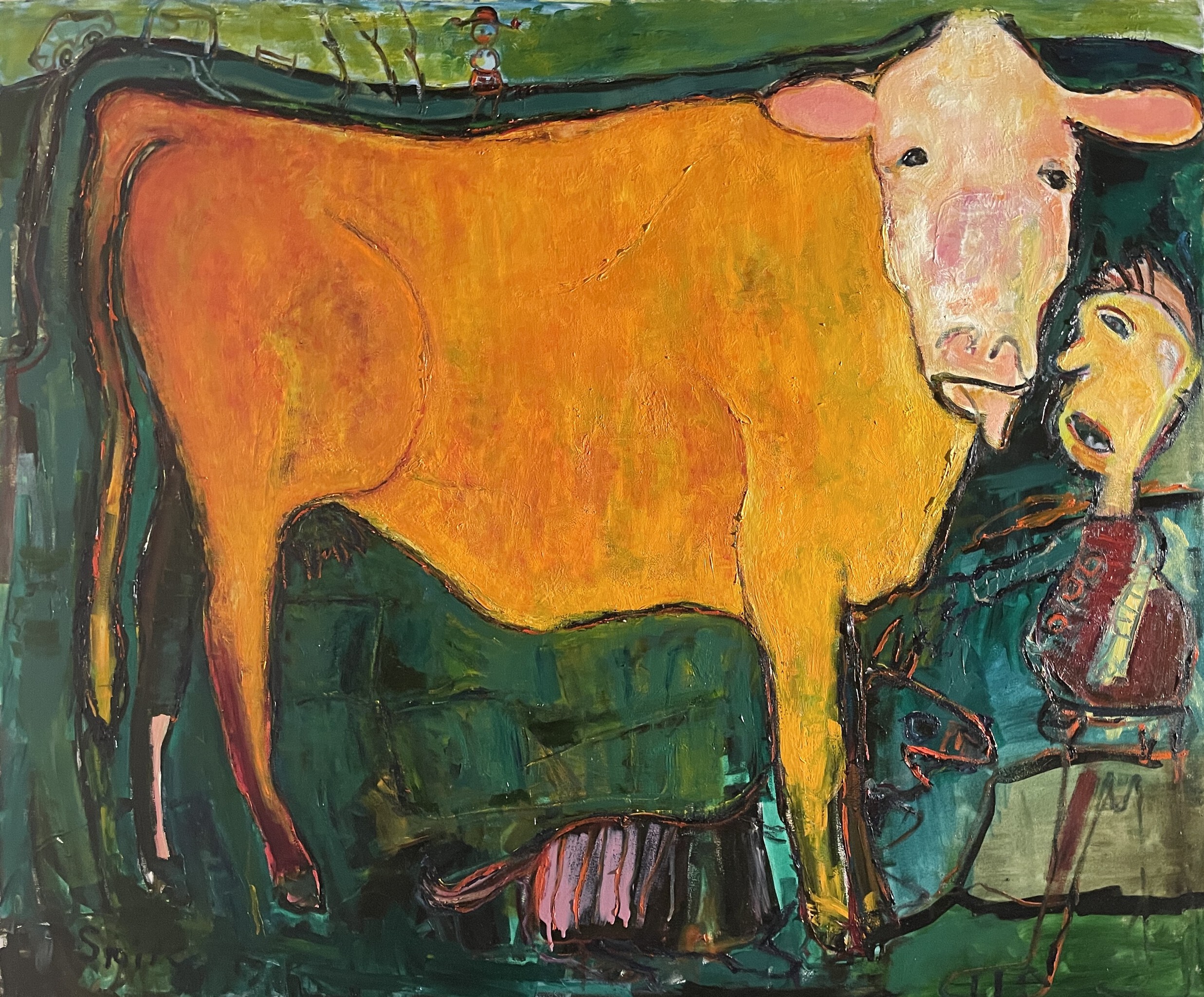 Koeien zijn nieuwsgierige dieren die graag naar je toekomen om te likken en te laten aaien. Om het toneeltje te vervolmaken heb ik op de voorgrond een hond toegevoegd en aan de horizon ondermeer een auto, een bomenrij en een meisje. Ik houd er van om het onderwerp zoals deze koe uit te vergroten en passende details toe te voegen aan anders lege ruimte.