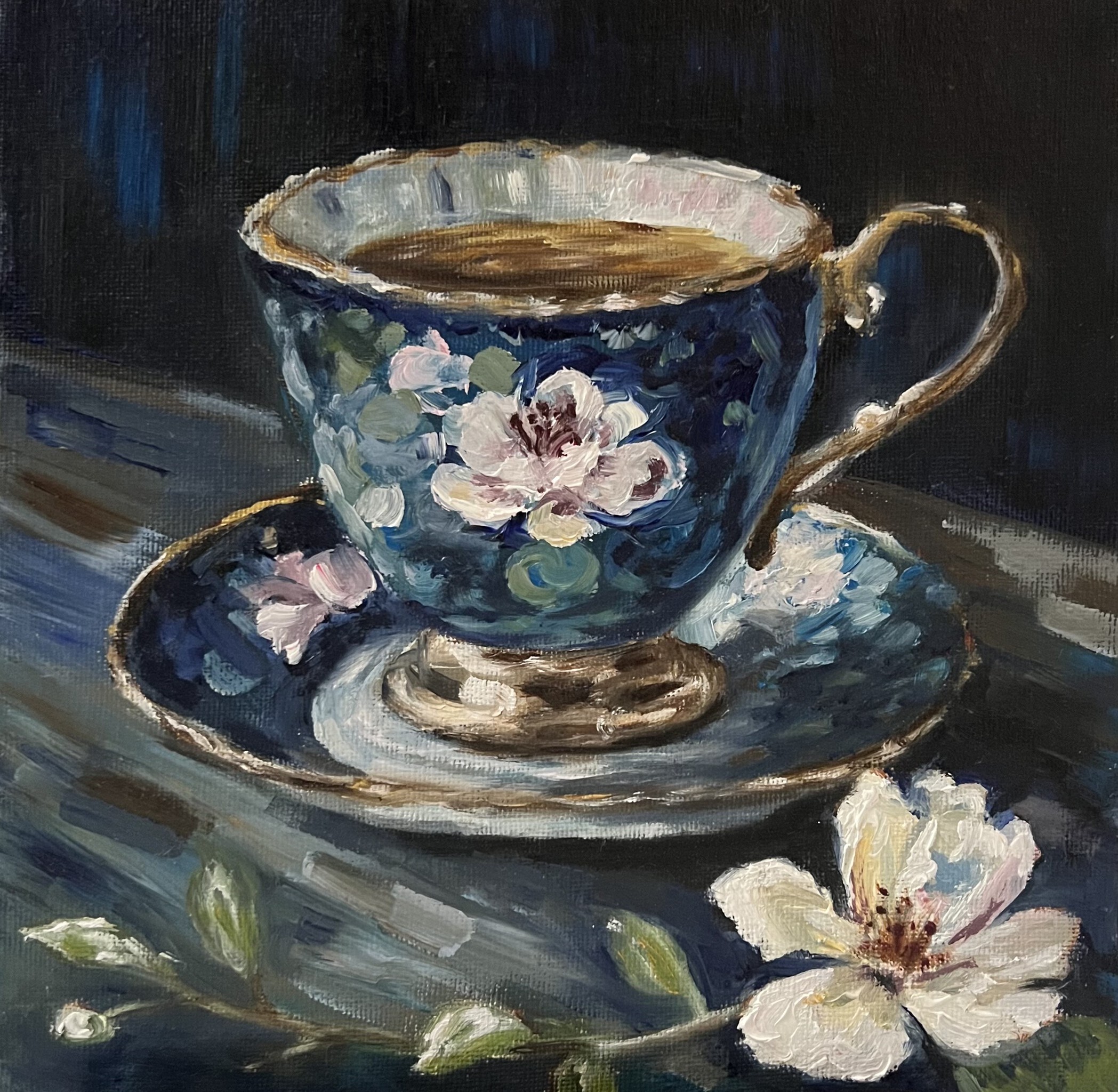 Figuratief Olieverf Bloem Stilleven Tea Thee Huiselijk Penseelstreken Alledaags Theekopje Kleinemomenten Bloementhee Kopjethee