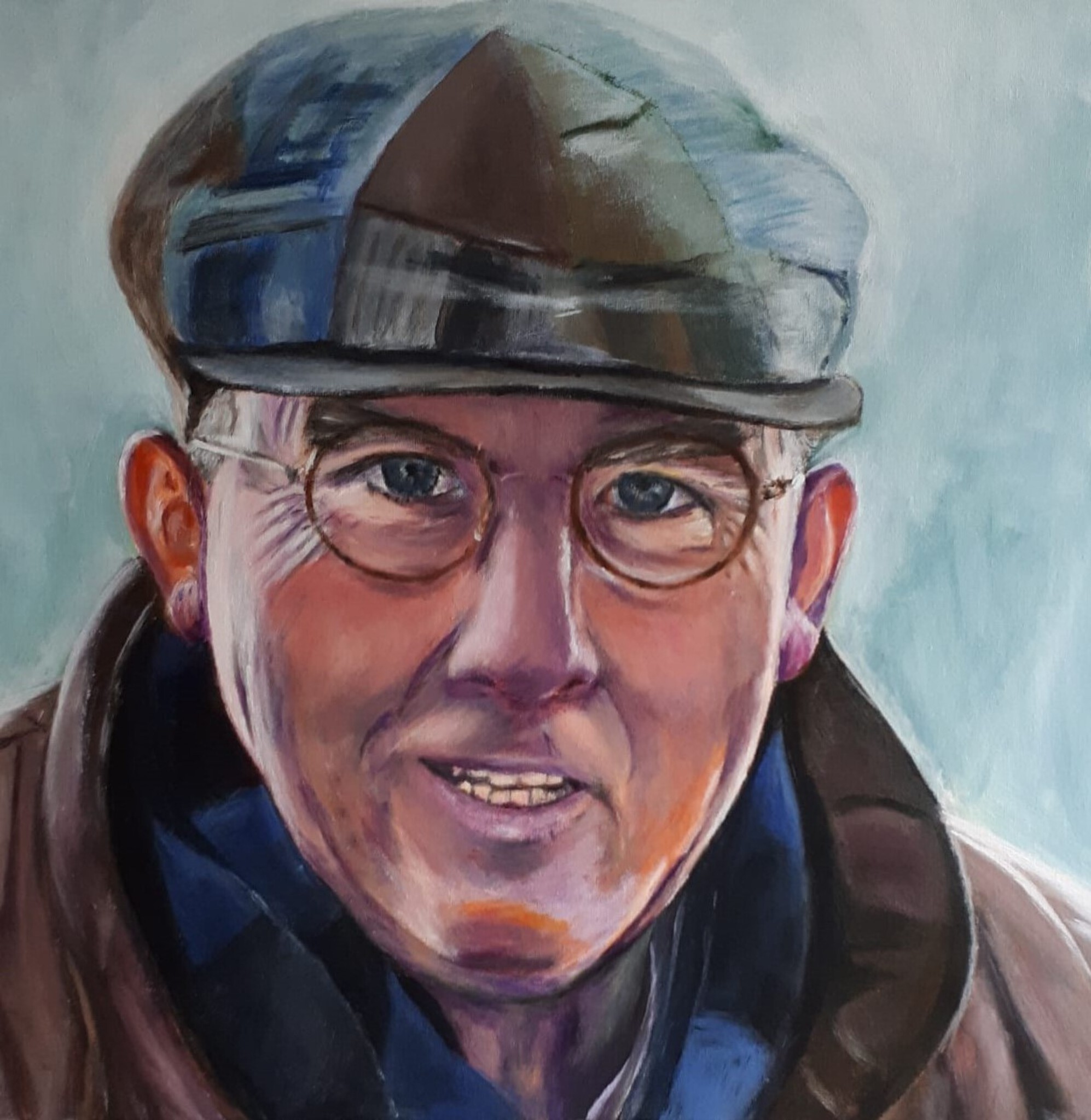 Mijn man Maas werd als volgende geschilderd. Het was een foto met tegenlicht, daardoor werd zijn gezicht wat donkerder.