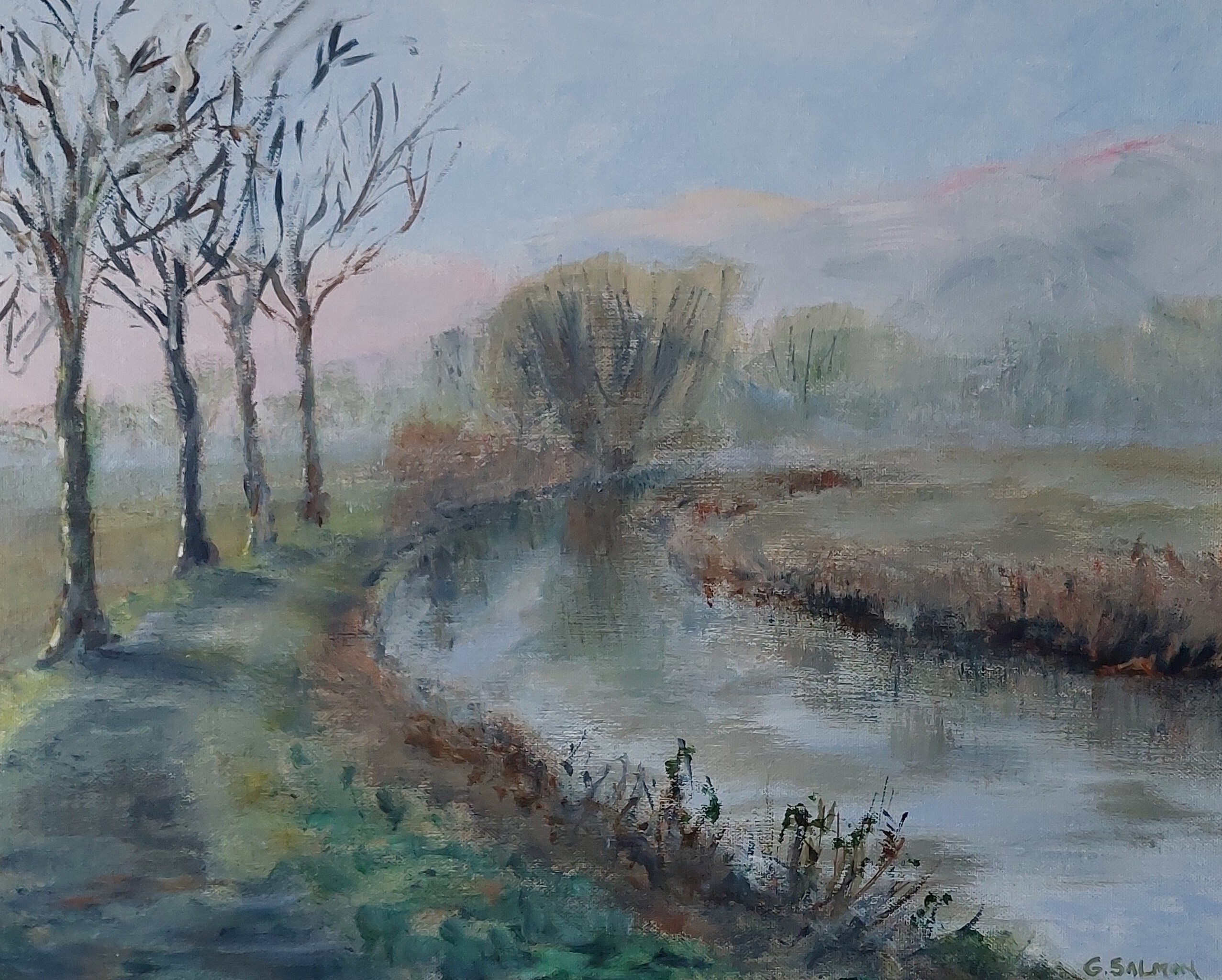 Mist Beek Pad Bomen Vaag Nevel Waterloop Struiken Winter