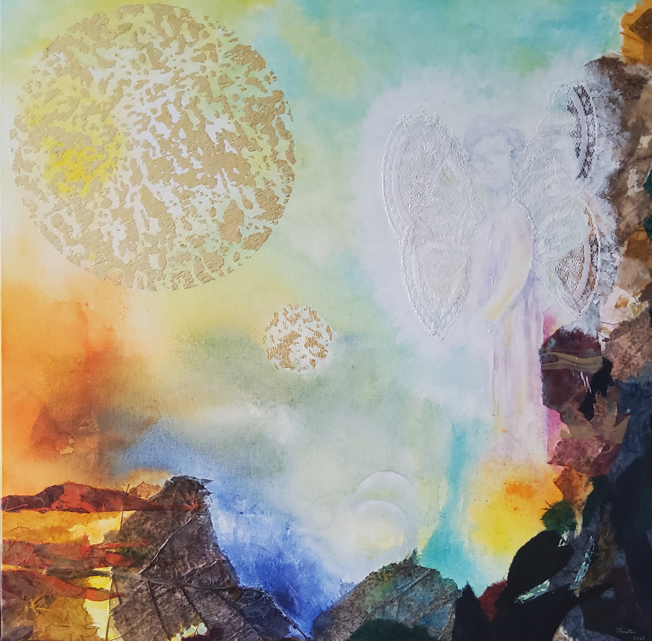 Geïnspireerd op de tekst in Mattheüs 28:5-6 Wie zoek je? Hij is hier niet, want Hij is opgestaan! Gemaakt op doek met rijstpapier, stof en acrylverf. Zijkanten van het 3D doek zijn meegeschilderd.8 Het werk is gevernist.