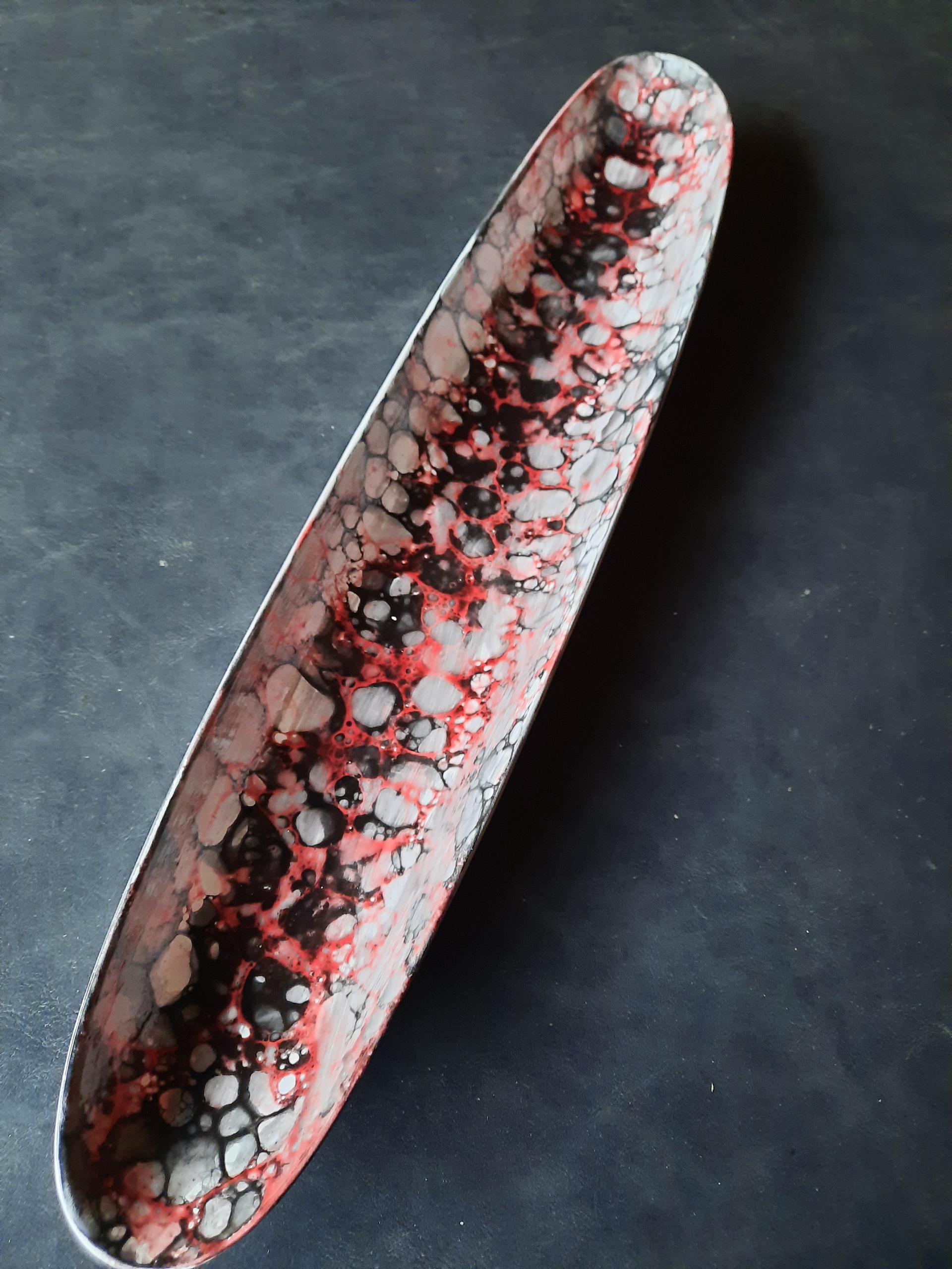 Een glazuur geblazen schaal. Wat kun je er allemaal niet op presenteren. Een lust voor het oog ,ook gewoon als sier schaal.