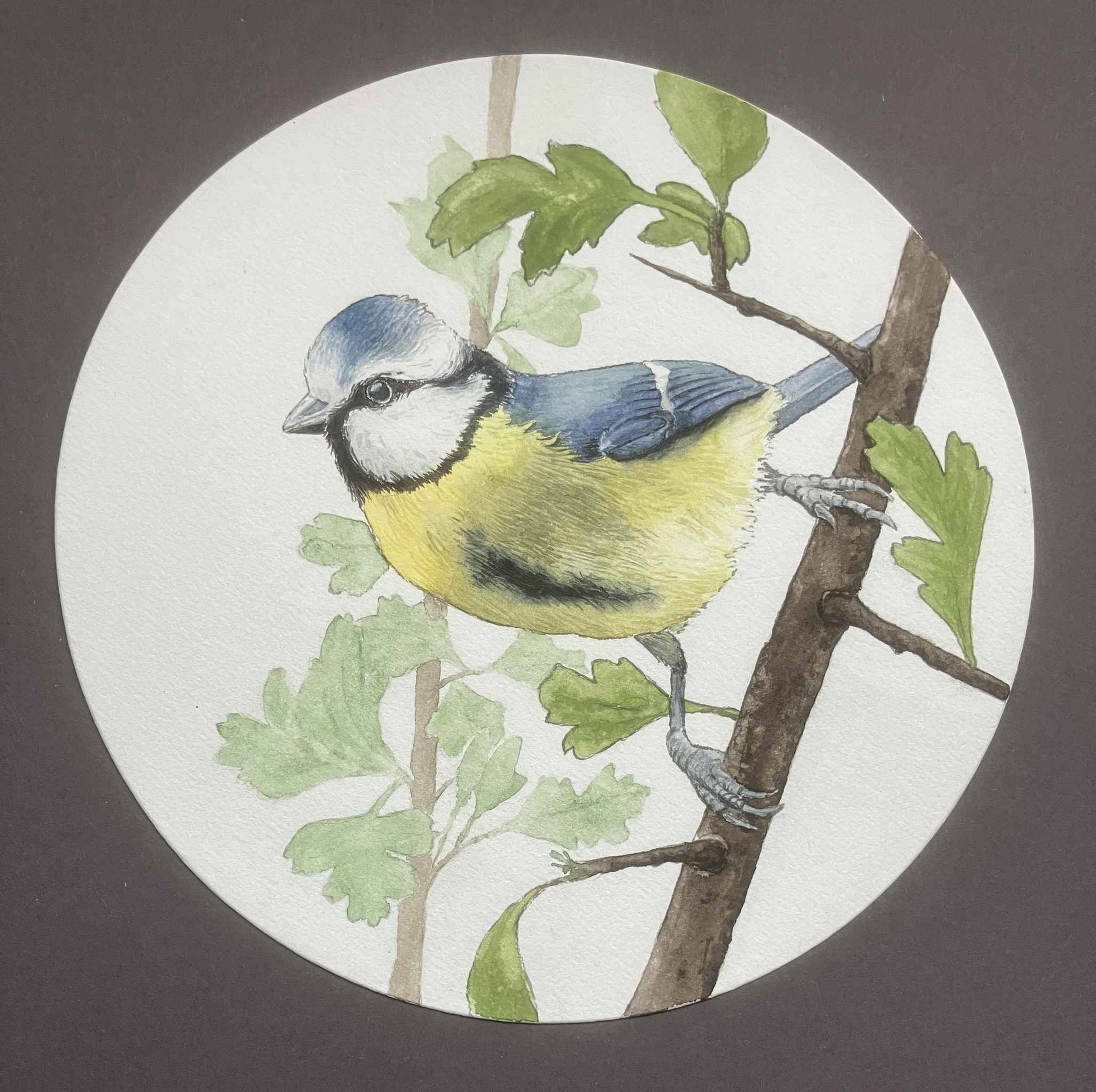 Pimpelmees in meidoorn. Aquarel met Chinese inkt. Rond, doorsnede 16 cm.