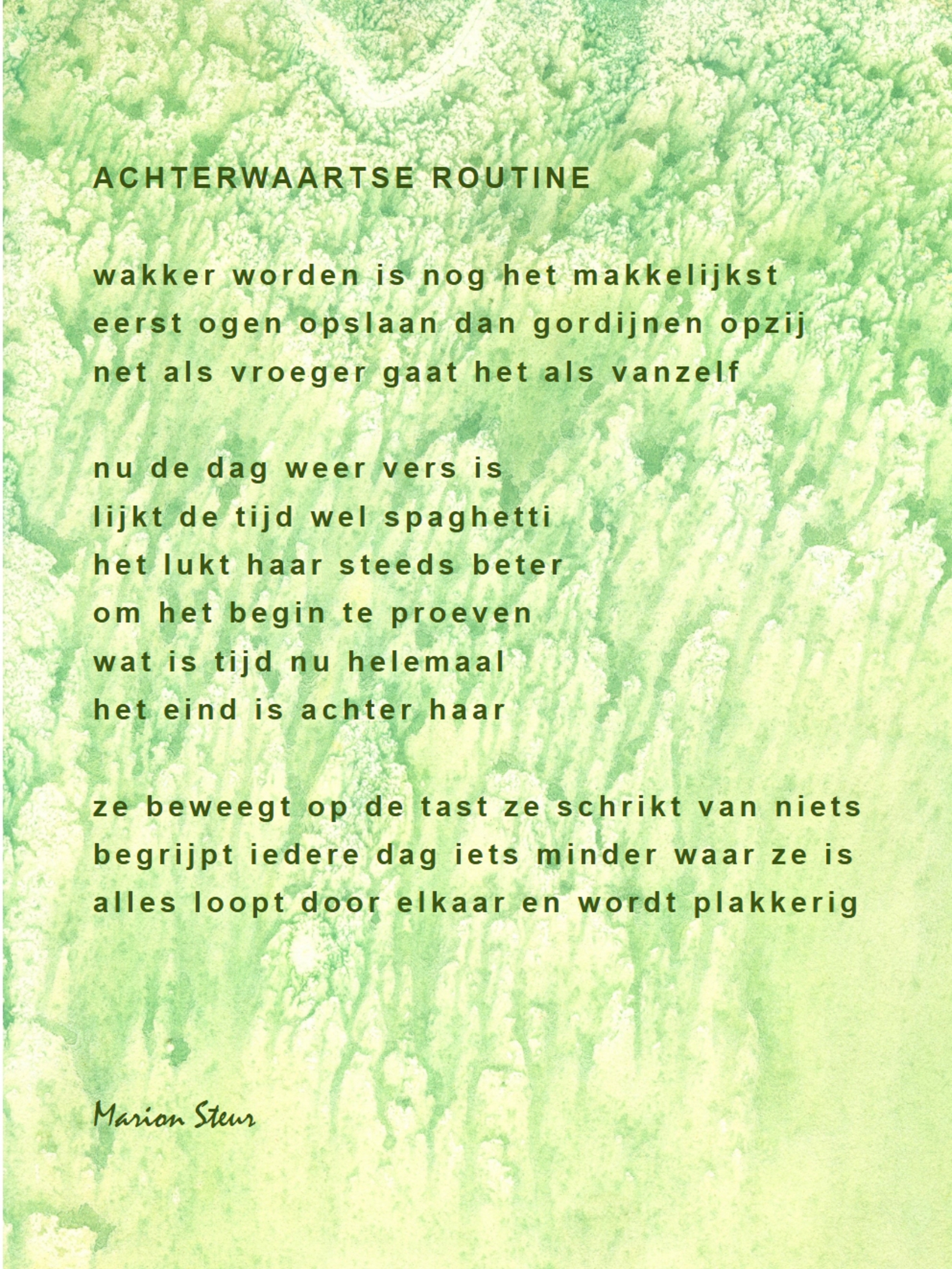 Dementie is ongrijpbaar en onstuitbaar. De patiënt en de naaste zoeken in eeuwig nu naar nieuwe verhoudingen. Het proces is letterlijk uitputtend. Dit gedicht werd geschreven naar het thema metamorfose van Poëzieweek 2026. In beperkte oplage beschikbaar in een formaat naar keuze in maatverhouding 4 x 3.