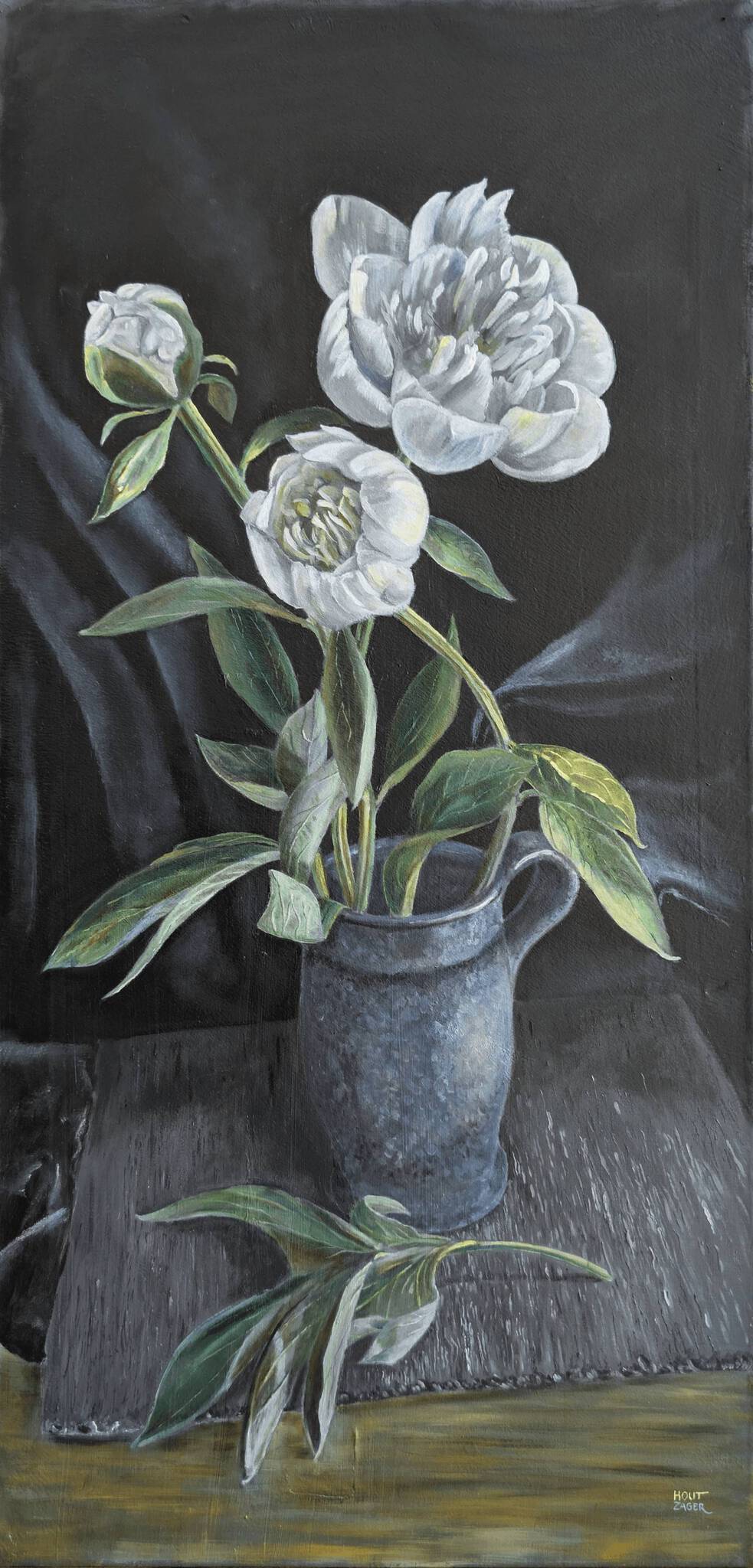 De vrouw die me de opdracht gaf voor dit schilderij houdt heel erg van pioenrozen – ik ook! Ze heeft, als het seizoen er is, altijd een flinke bos pioenrozen op tafel staan. Hoe ze in korte tijd van een kleine hele compacte bol naar een tien keer zo grote luchtige bal van kronkelige blaadjes kunnen transformeren is fascinerend! Ze heeft een redelijk aantal vazen in huis, variërend van hele grote glazen tot wat bescheidener keramiek, echt mooie exemplaren in authentieke stijl. Ja natuurlijk ook veel HK living spul maar deze blauwe is handwerk uit de seventies. Ook heeft ze een aantal leisteen blaadjes liggen waarop bijvoorbeeld een sinaasappel en banaan naast elkaar mooi liggen wezen. Ze heeft erg veel gevoel voor styling en een beetje drama. Maar het fruit mag gewoon geconsumeerd worden. Ik heb er voor gekozen om niet een paar bloemblaadjes naast de vaas te leggen maar juist een groter blad. Bij het op vaas zetten moet je altijd wat groen snoeien. Een beetje opofferen zeg maar, voor het resultaat. En dat typeert deze vrouw – veel heeft ze opgeofferd in haar leven – some een keuze, soms niet.