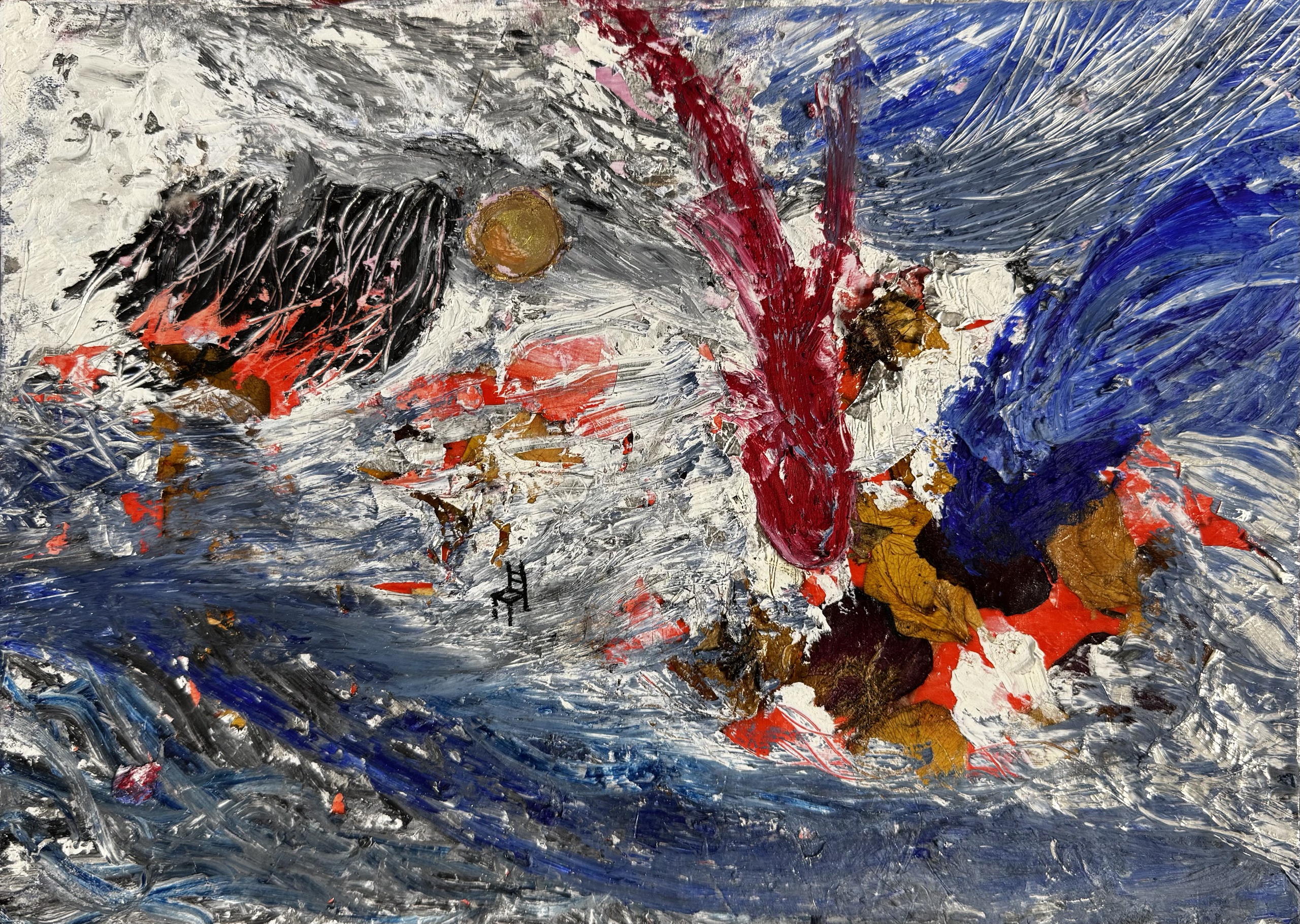 Mixed media on paper — oil pastel, flower fragments, and silver foil 21 × 29,7 cm 2025