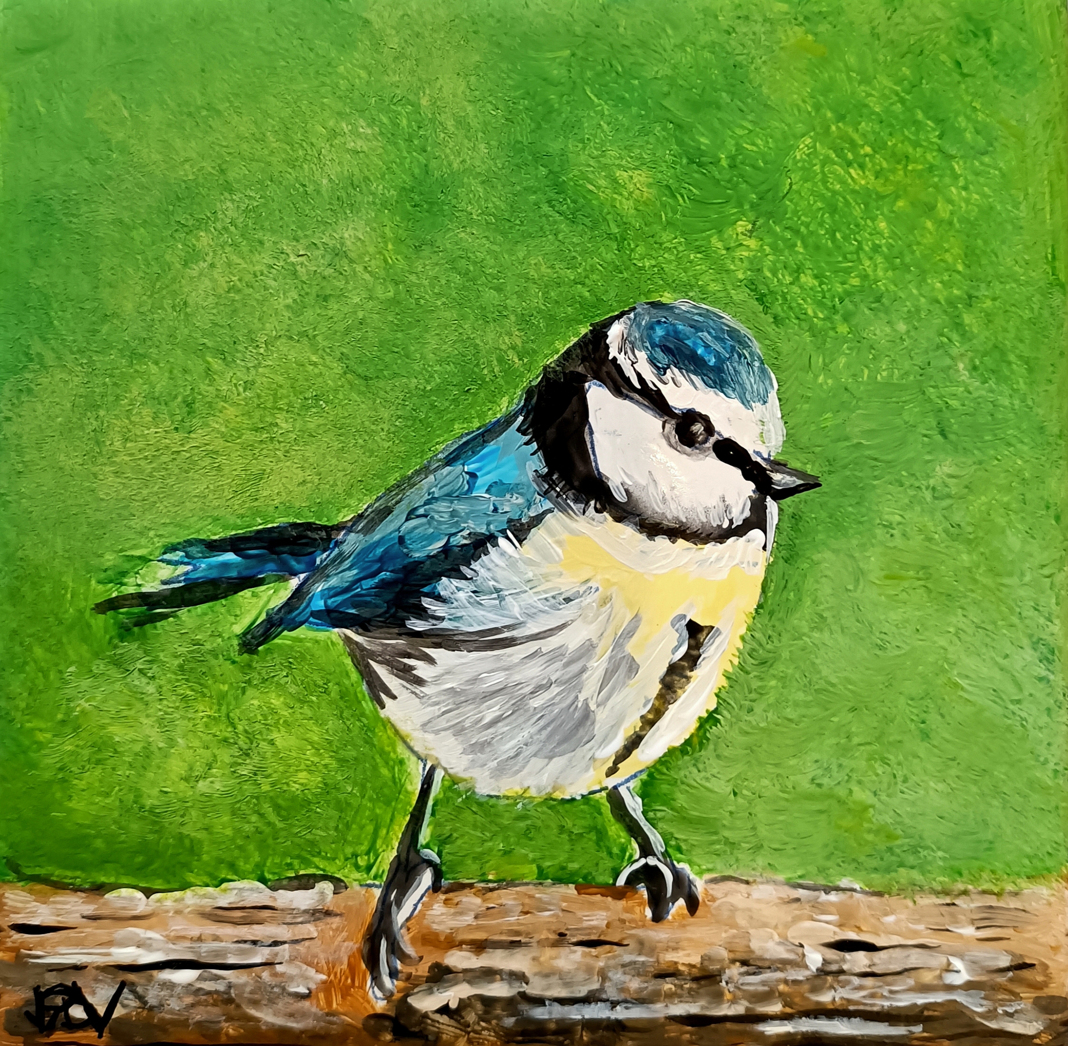 Een pimpelmeesje geschilderd op een tegeltje t.b.v. een geldinzamelingsactie en verkoop voor een nieuw te bouwen hospice in Woerden.