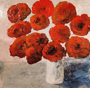 In de reeks 'Groeiwijzen' dit boeket rode rozen. Klaar om te hangen. Olieverf en pastel oliekrijt.