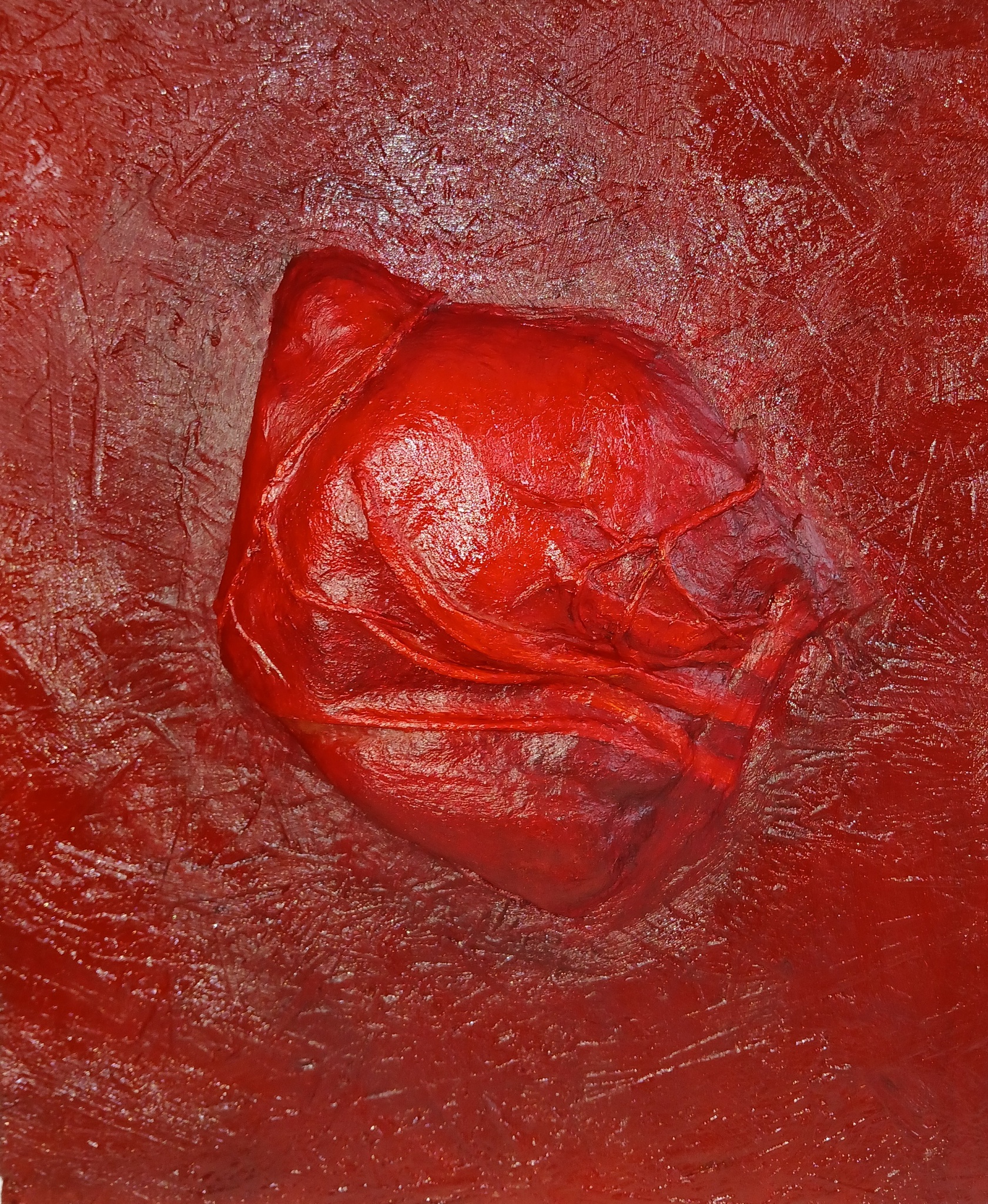 Mixed media 3d schilderij; olieverf met gehard textiel en touw op OSB paneel