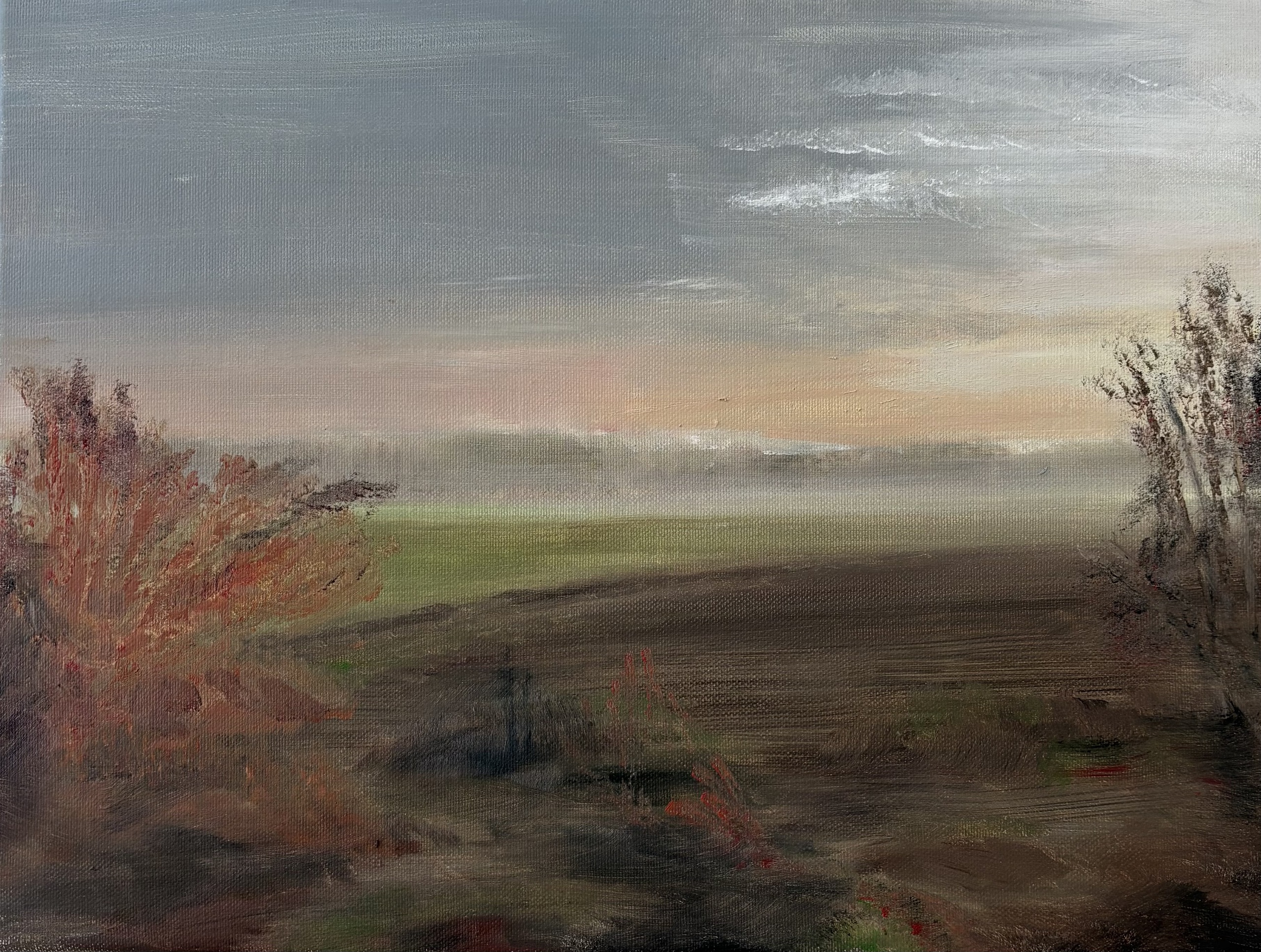 Early Spring, with fog hanging over the field.
