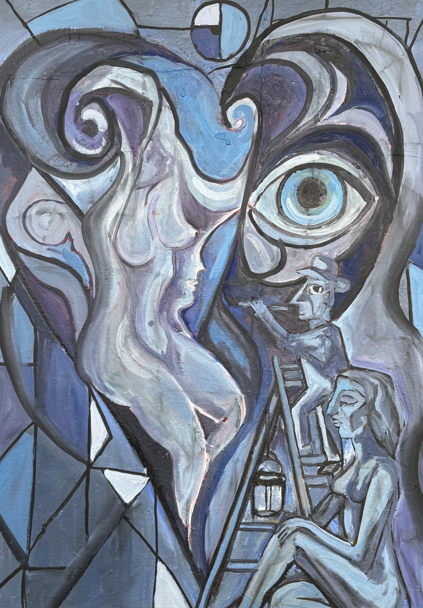 Kunstschilder lopend op de oneindige weg van het ex- en imploderen, waarin de kern, de onbegrensde zuiverheid, als eeuwig wordt ervaren. Dit weergegeven op het linnen van realistisch tot abstract