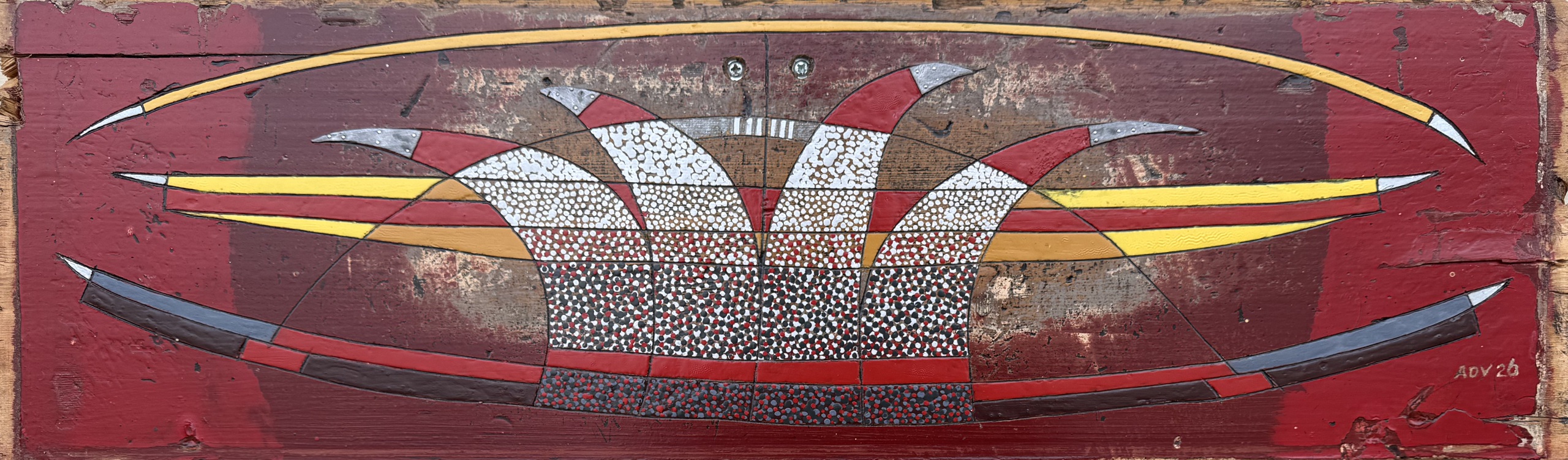 Traptrede met een grote slijtplek. Er is blijkbaar veel op gelopen. De donkerrode en rode kleuren rechts en links zijn origineel. De lijnen zijn gezaagd en weer opgevuld met zwarte kit. Meerdere vlakjes tussen de lijnen heb ik beschilderd of bestippeld met kleuren als geel, rood, antraciet en bruin. Op de punten van de vier gebogen figuren is lood bevestigd. Twee 'ogen' zijn erin geboord en opgevuld met bolschroeven.