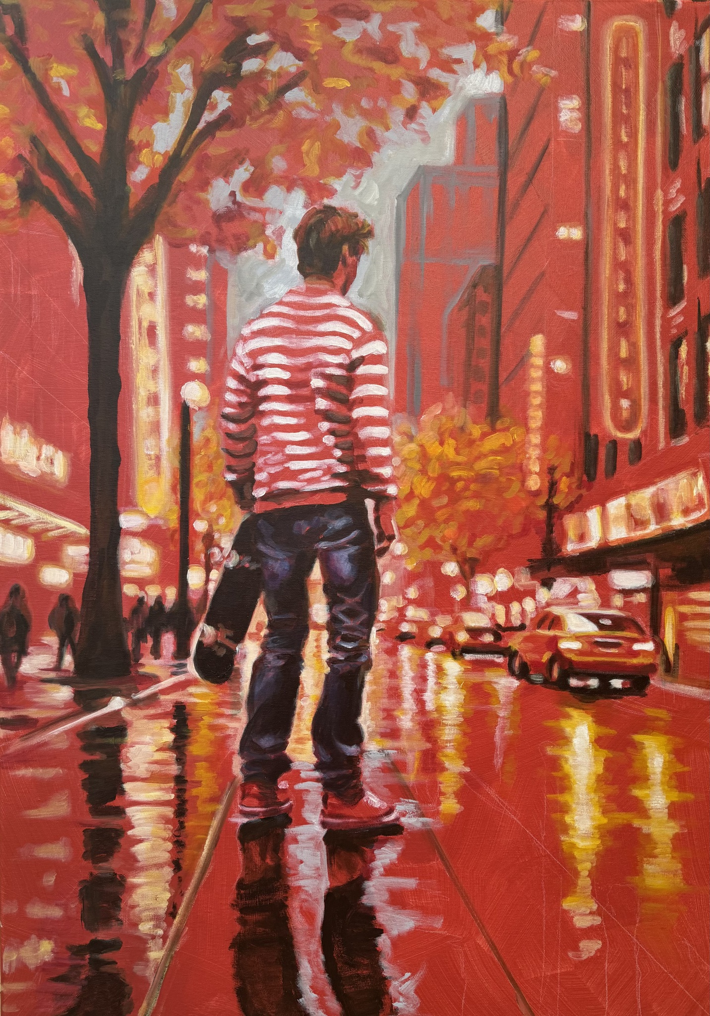 Acryl Rood Stad City Regen Weerspiegeling Neonreclames Auto’s Geel Boom Kunst Schilderij Canvas