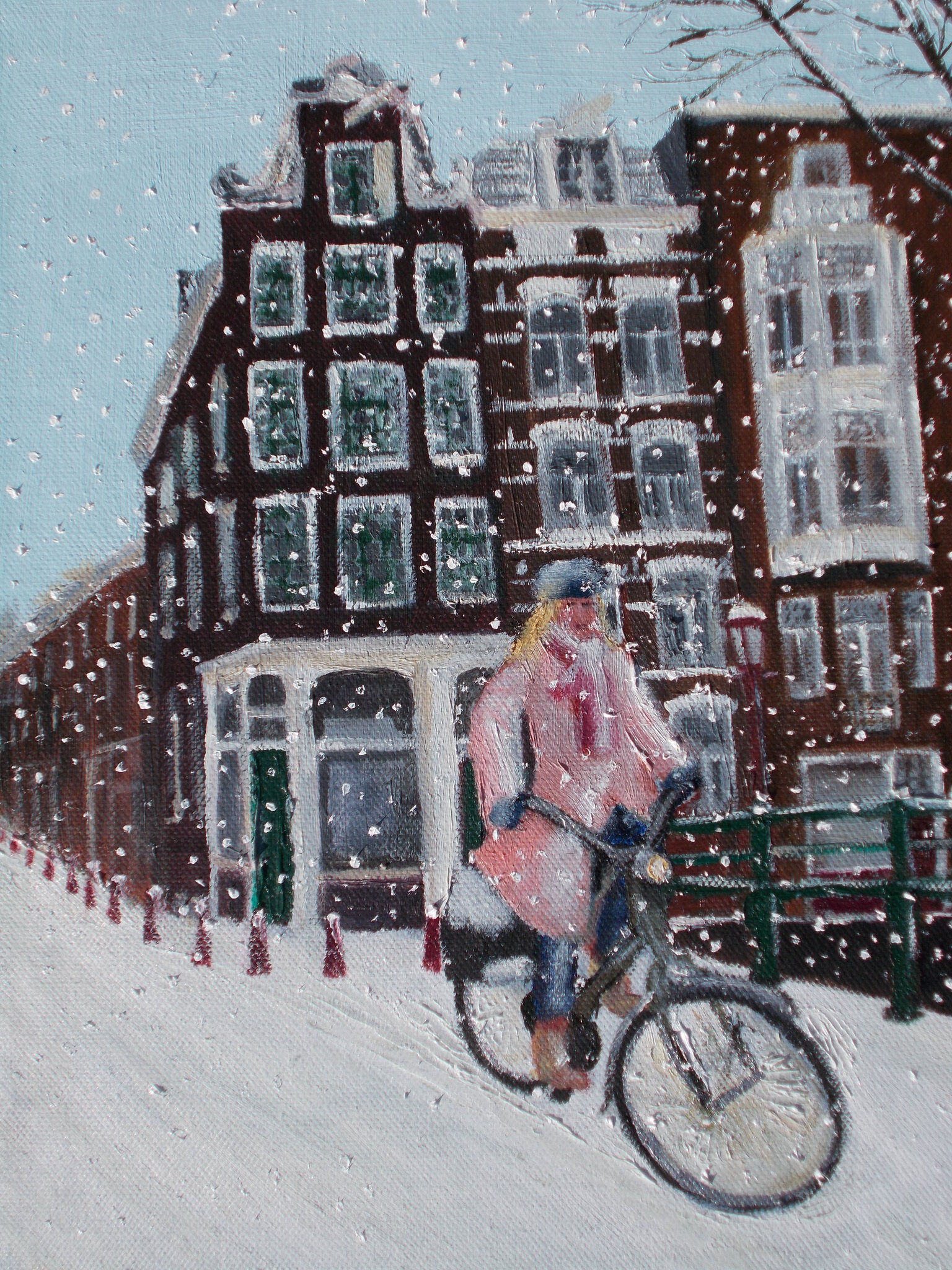 Jonge vrouw op de fiets, ploeterend door de sneeuw in de Amsterdamse binnenstad. Ingelijst in geprofileerde, houten lijst.