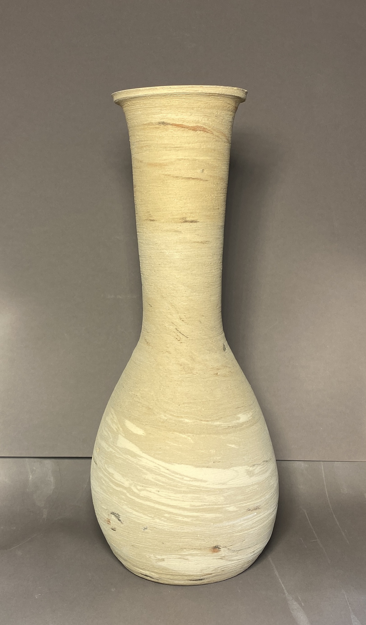 Vaas no 7 (hoogte 42 cm) licht gemarmerd en biscuit gestookt op 1020 C. deze vaas is voor decoratieve doeleinden maar kan waterdicht gemaakt worden