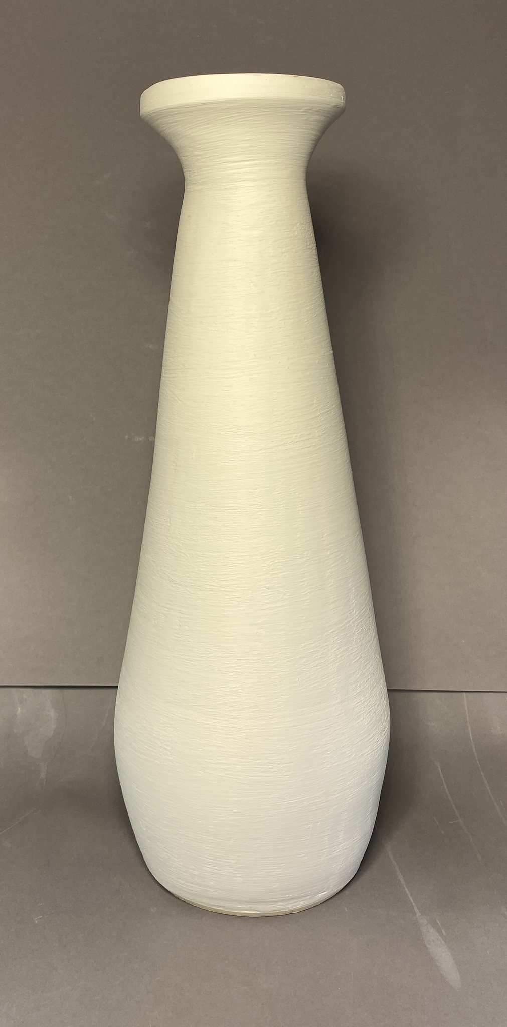 Witte hoge vaas (hoogte 43 cm) met engobe. Biscuit gestookt op 1020 en glazuur gestookt op 1140 C. De vaas is niet waterdicht en dus voor decoratieve doeleinden, maar kan op verzoek waterdicht gemaakt worden.