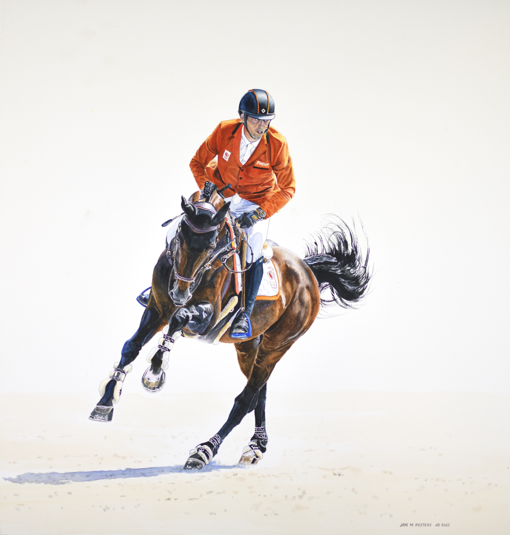 ‘Focus’ lijkt mij de meest passende titel voor deze aquarel die ik maakte van springruiter Harrie Smolders en Uricas van de Kattevennen. Het is een moment tijdens de Olympische Spelen van Parijs (2024), gefotografeerd door Leanjo de Koster (Digishots). Ik ben helemaal weg van de prachtige en krachtige houding van het paard, de concentratie van de ruiter en het prachtige licht dat overal weerkaatst.