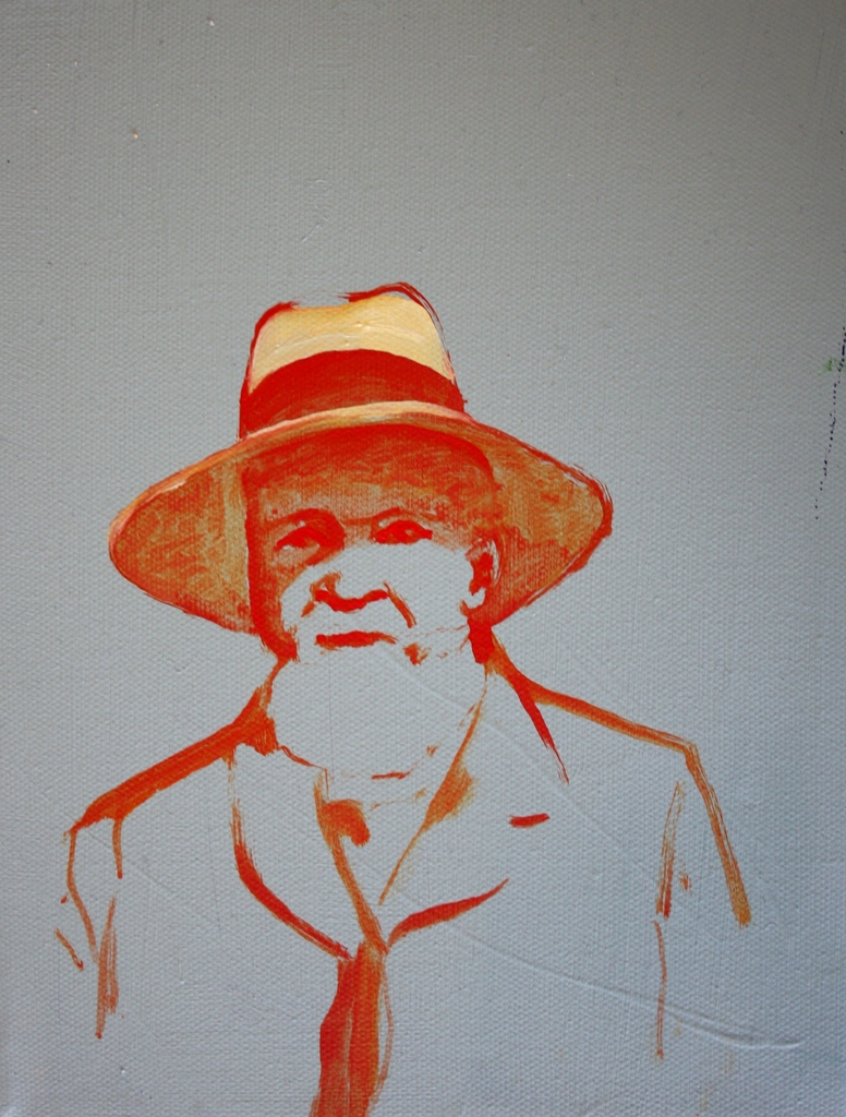 Lichtblauwe achtergrond met rood/oranje portret