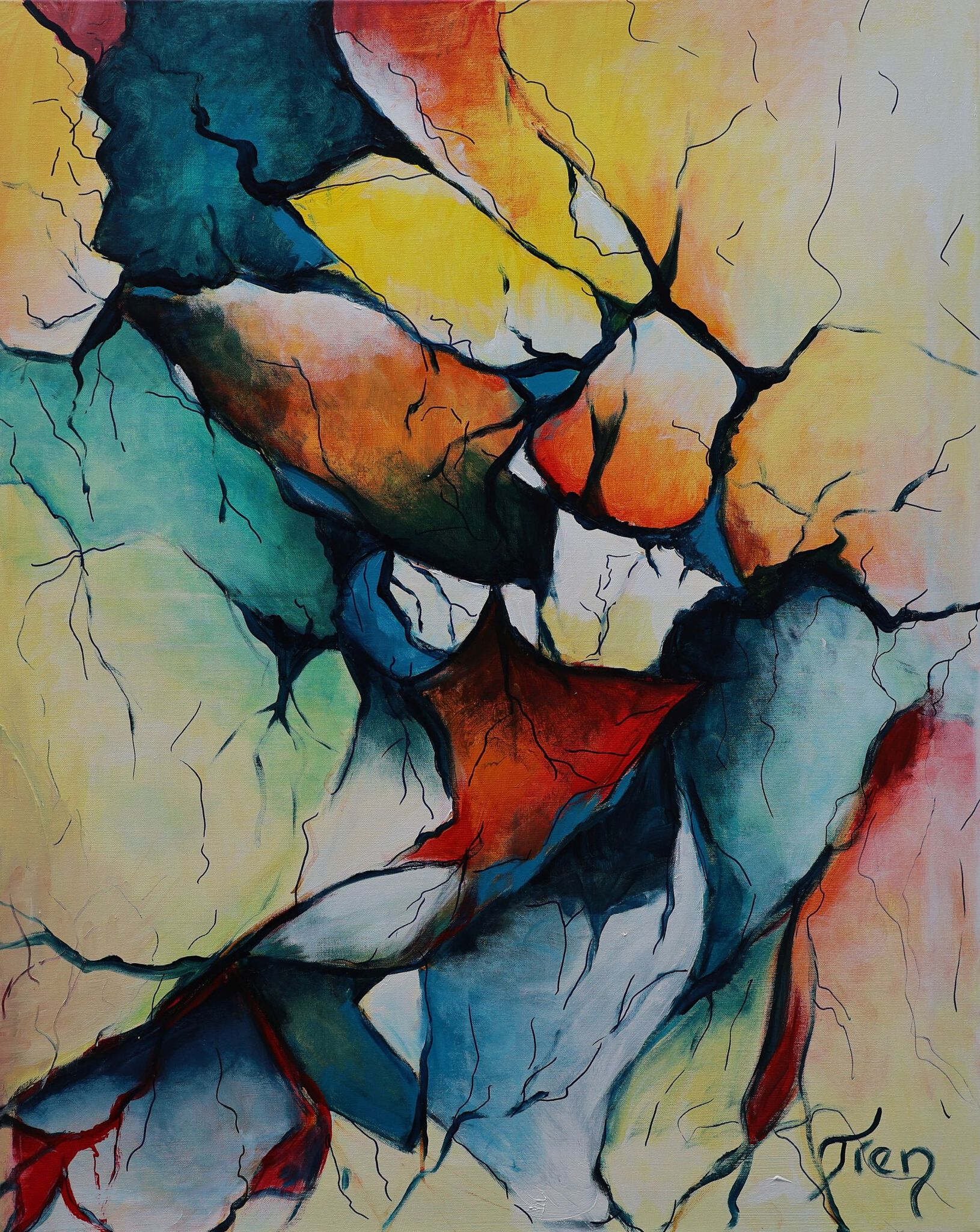 Verdorde aarde Een kleurrijk acrylwerk. Het lijnenspel symboliseert de barsten in de aardkorst die aan het verdrogen is door het klimaat.