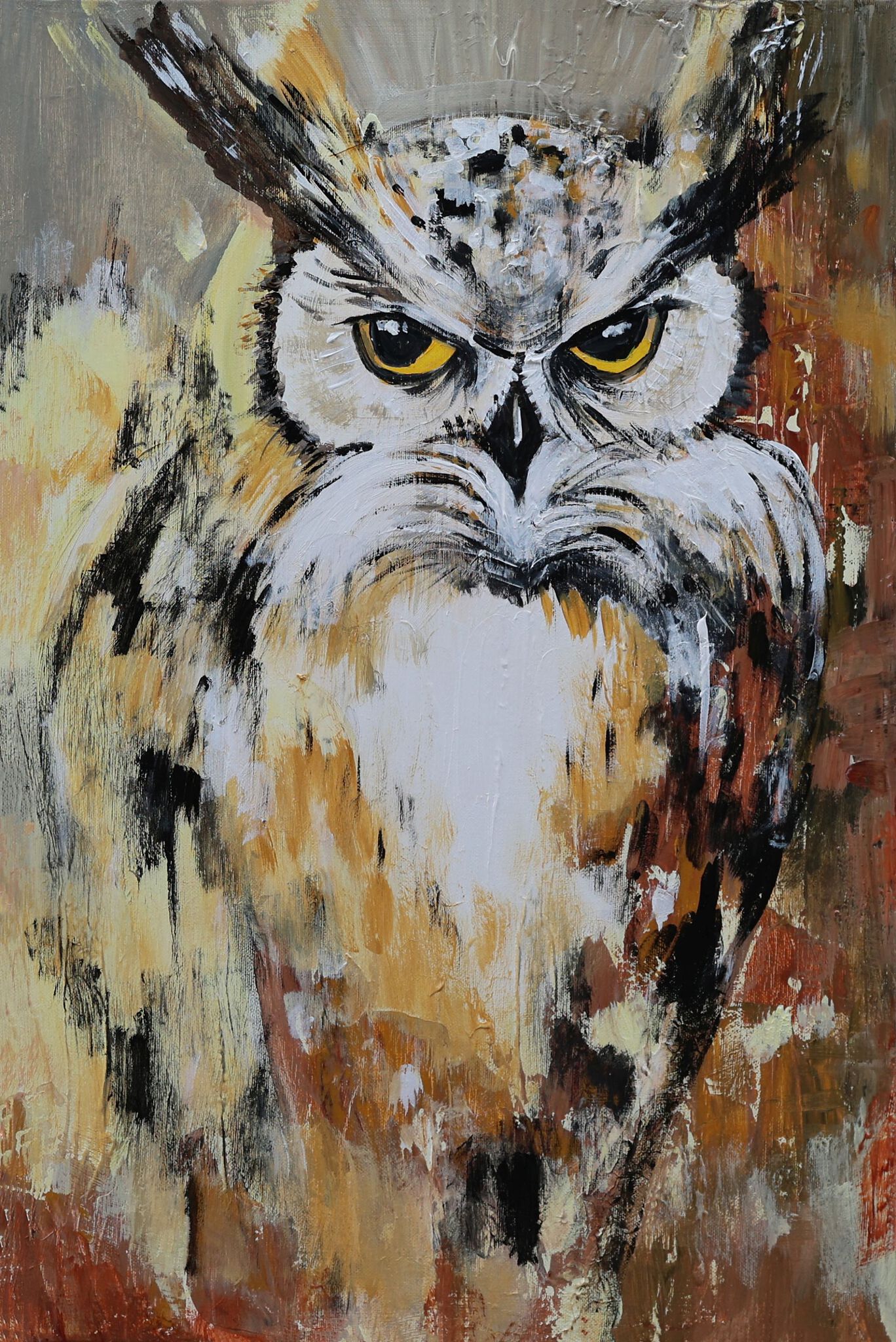 Een strenge uil Een streng kijkende uil in acryl. Wat beloert hij? Een prooi? De veren van de uil zijn realistisch en in aardtinten.