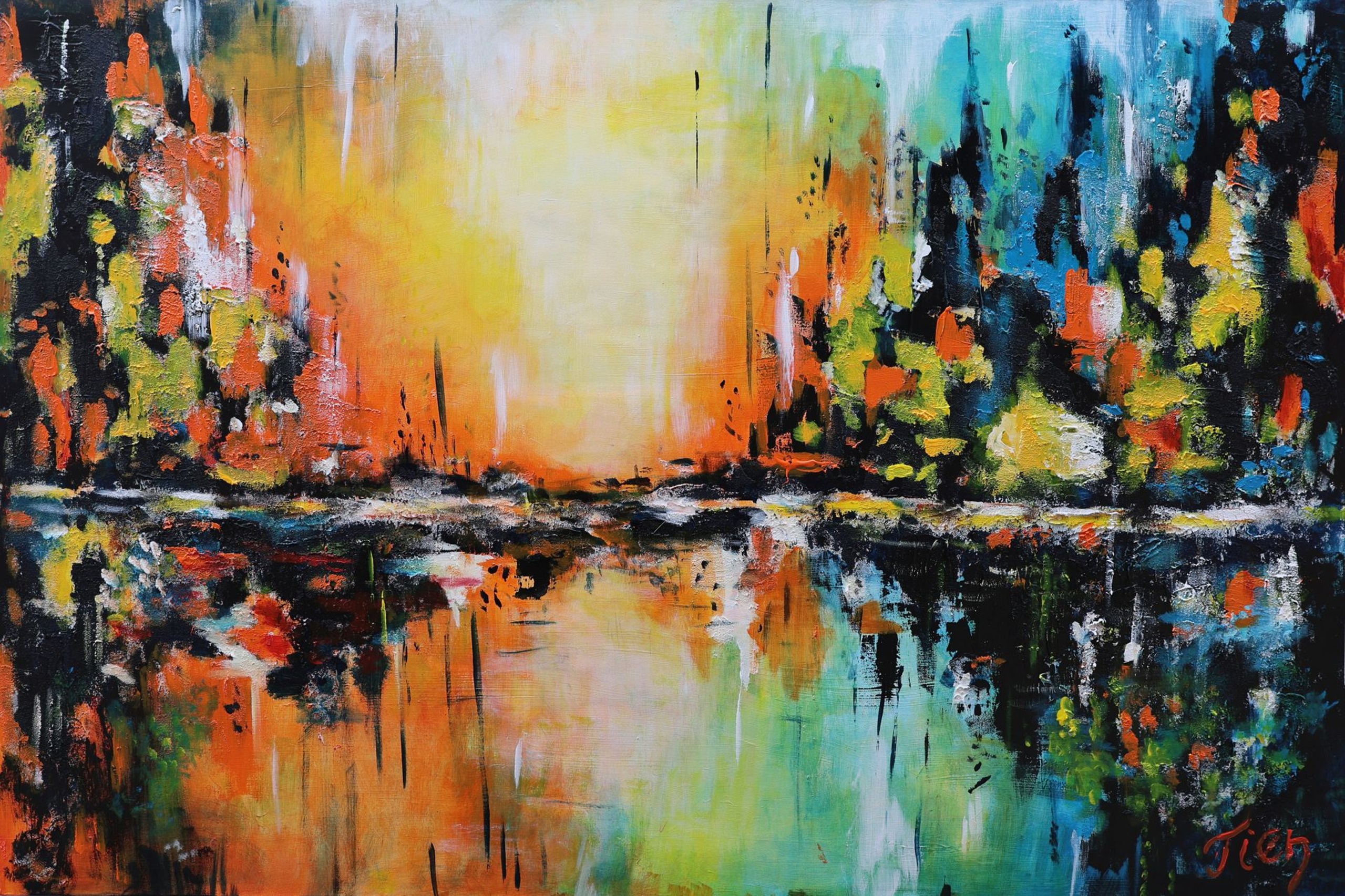 Een spiegellandschap Een groot spiegelend landschap dat in het water weerspiegelt. Zeer kleurrijk acryl werk. Bewerkt met paletmes in zeer dikke verf en met veel mixed media als opdikking.