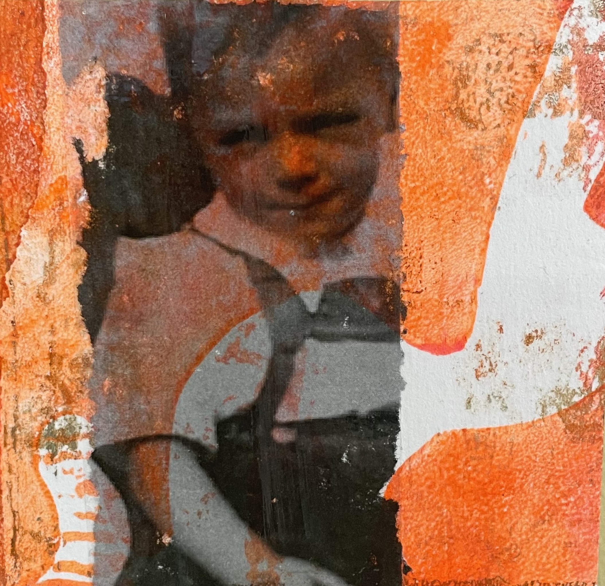 Jongen Kleintje Jeugd Kleuter Kind Zoon Vroeger Oranje Zwart Wit Papier Hout Mixed Media Schilder Verf Vader Ouders