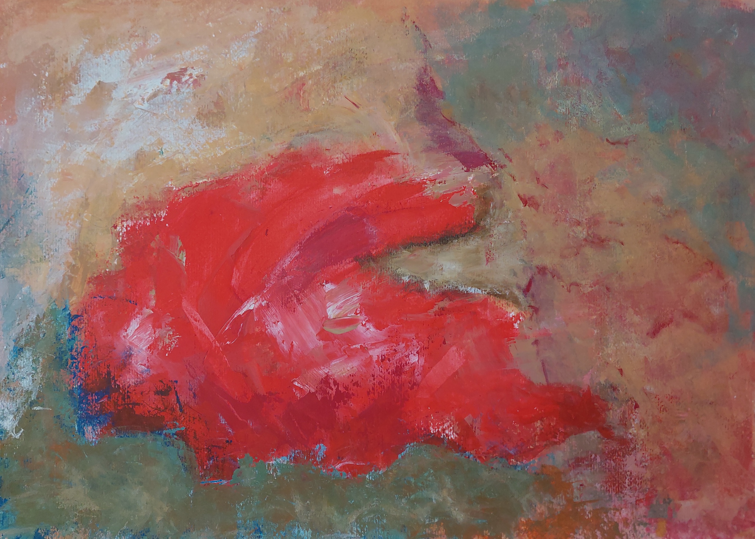 Een krachtig rood vlak lijkt als een kloppend hart te zweven in een zachte, aardse omgeving van beige, groen en blauwe tonen. De losse, expressieve penseelstreken geven het werk een gevoel van emotie en intensiteit, alsof energie zich vanuit het centrum naar buiten verspreidt. Het schilderij roept een directe, rauwe beleving op – warm, kwetsbaar en vol innerlijke beweging.