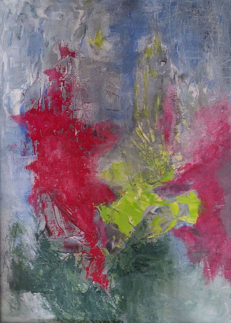 Felle rode en roze vlakken barsten open tegen een koele, blauwgrijze achtergrond, terwijl een helder groen accent als nieuw leven door het midden snijdt. De verf is energiek en gelaagd aangebracht, met sporen van beweging en contrast. Het werk straalt groei en tegendraadsheid uit — een explosie van kleur die zich losmaakt uit een stille omgeving en haar eigen ruimte opeist.