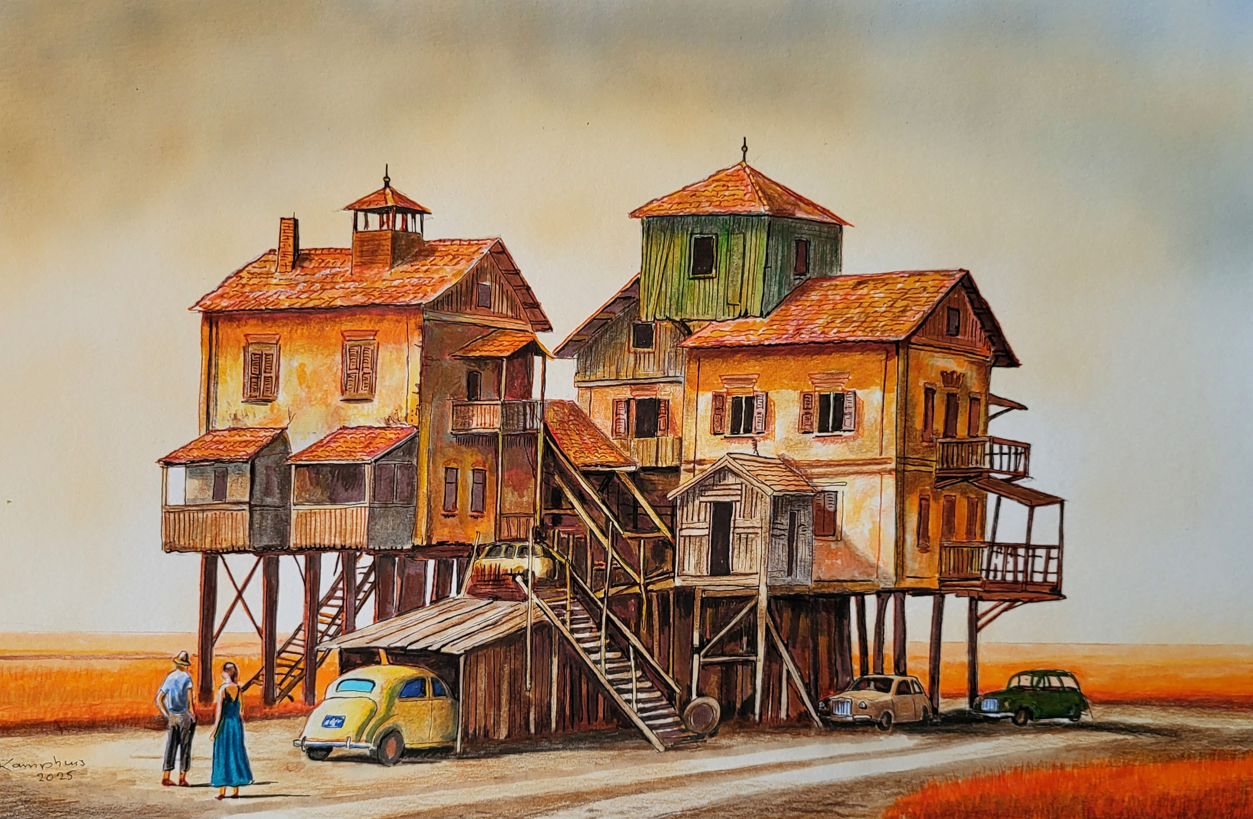 Een huis staat in een verlaten landschap. Een een volkswagen staat geparkeerd onder het huis.