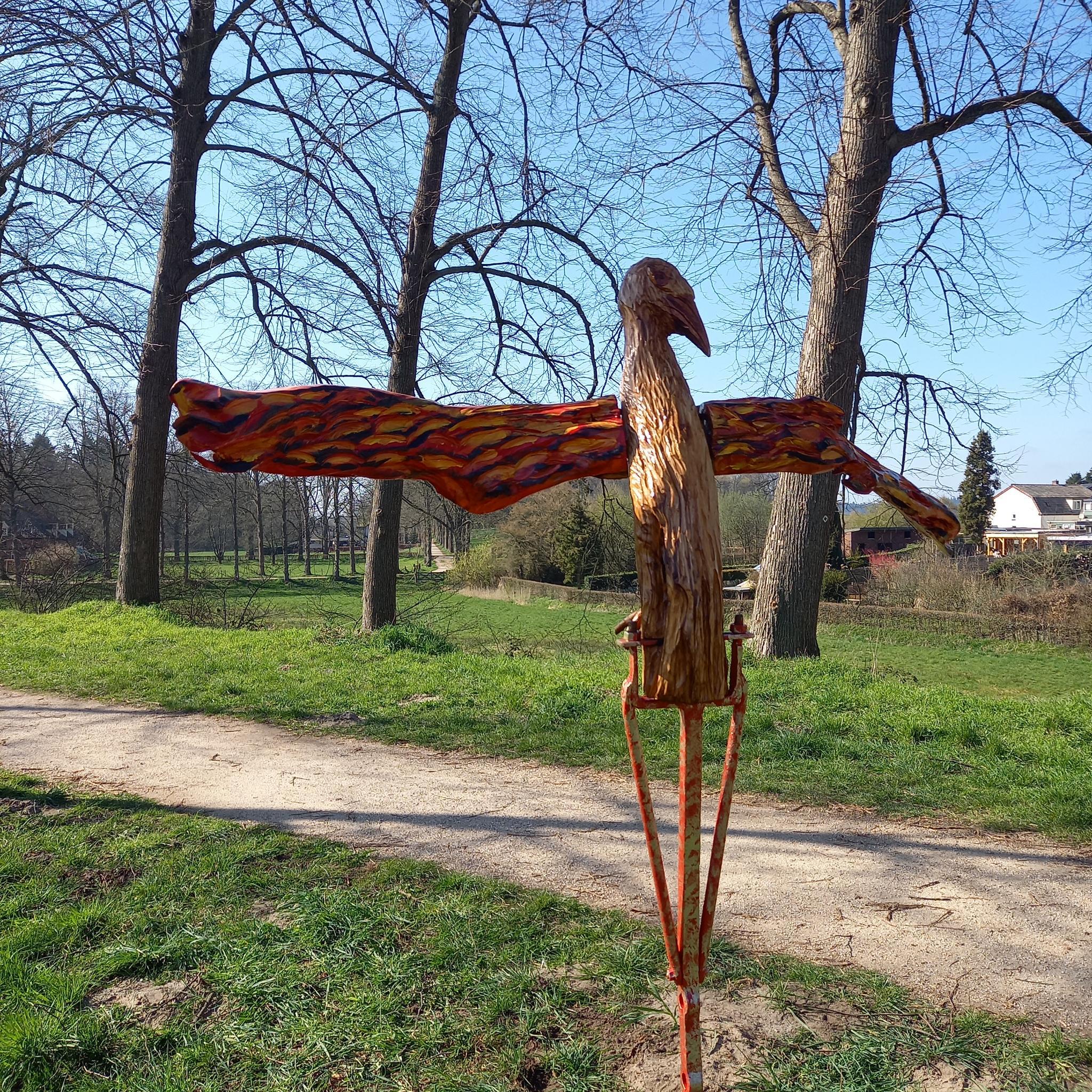 De vuurvogel Two faces is geplaatst op de Kunstwandelroute 2026 van Pasen tot Pinksteren. https://kunstwandelroutehuisbergh.nl De staart is van een stuk staal van mijn oude schip de vuurvogel.