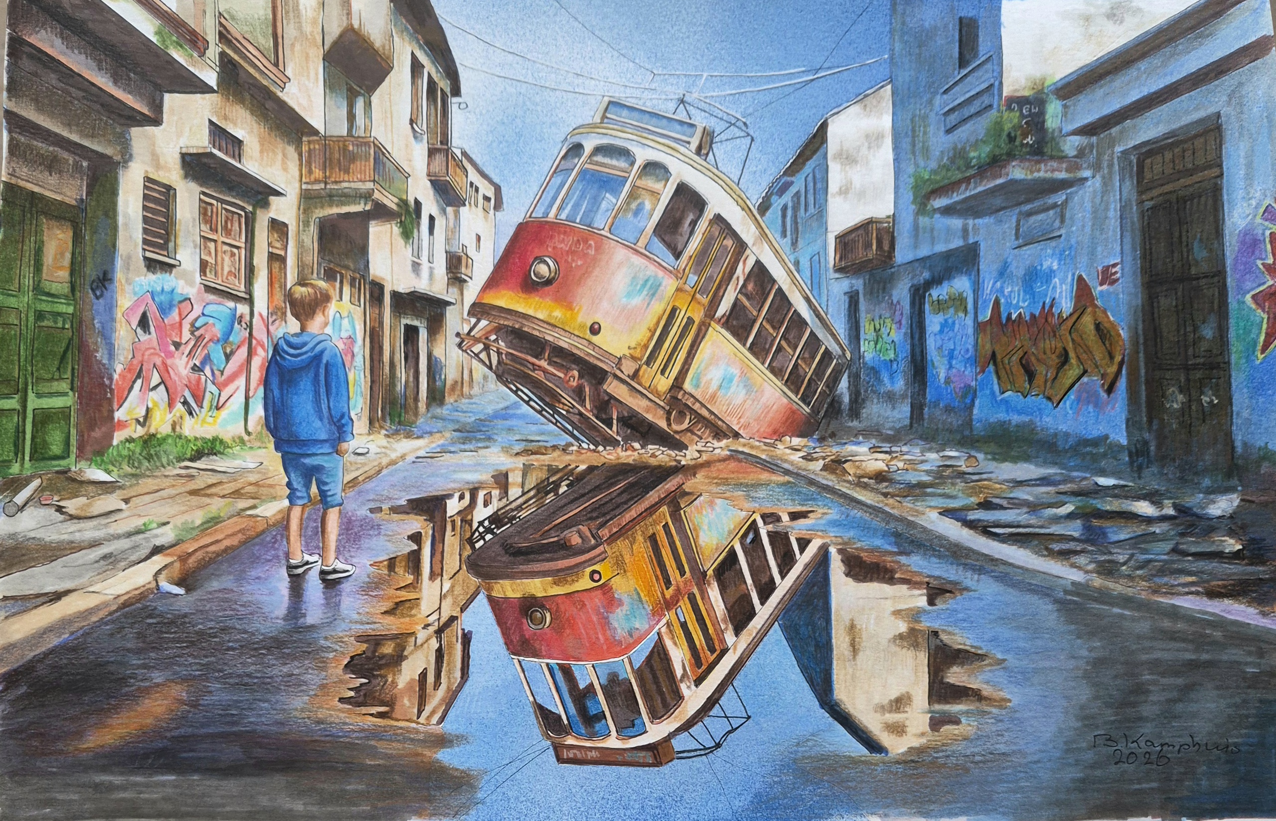 Een tram is uit de lucht komen vallen in een oude straat met graffiti