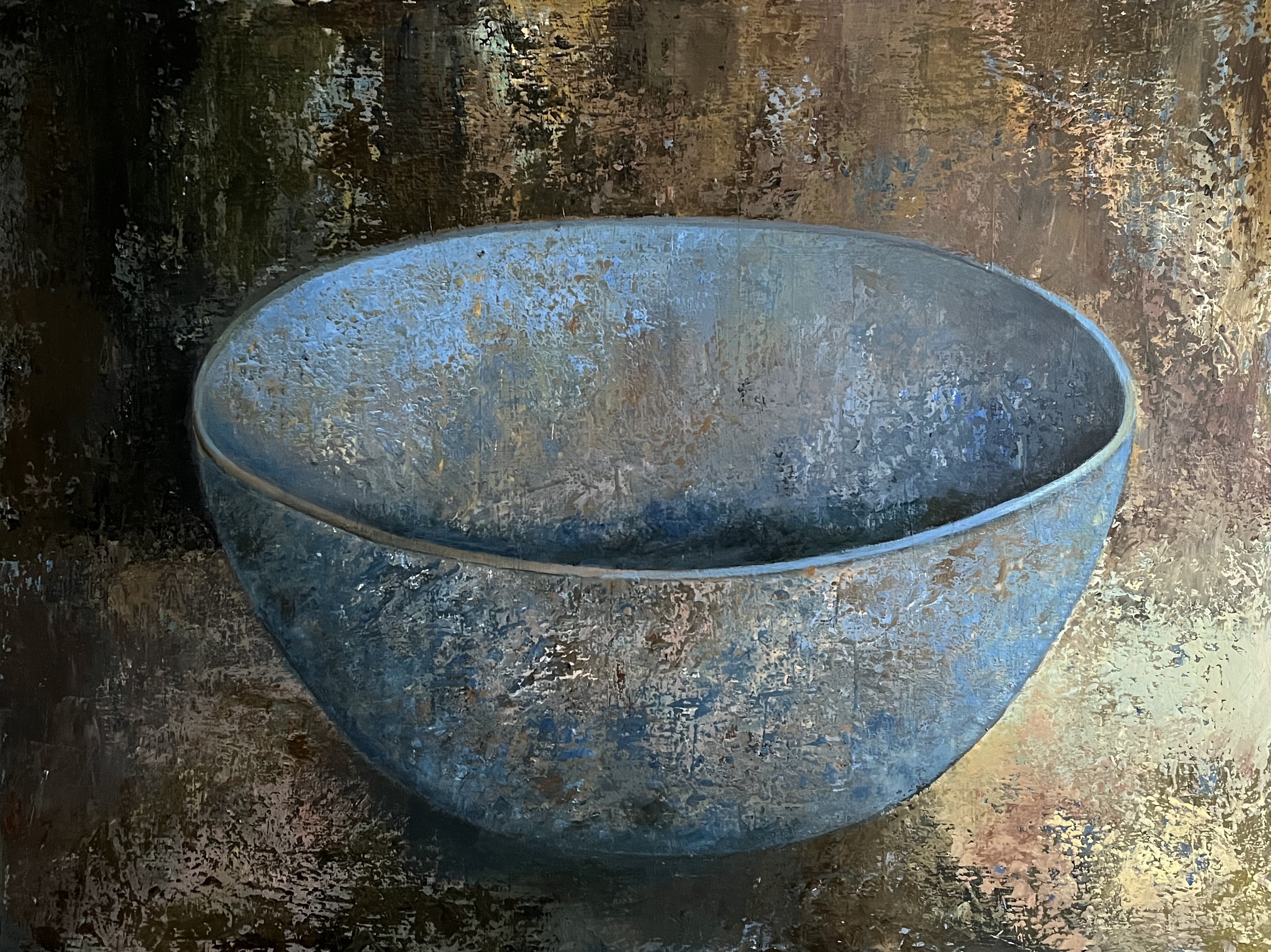 Blauwe schaal die door zijn textuur en zijn gelaagdheid een levendig oppervlak heeft verkregen.