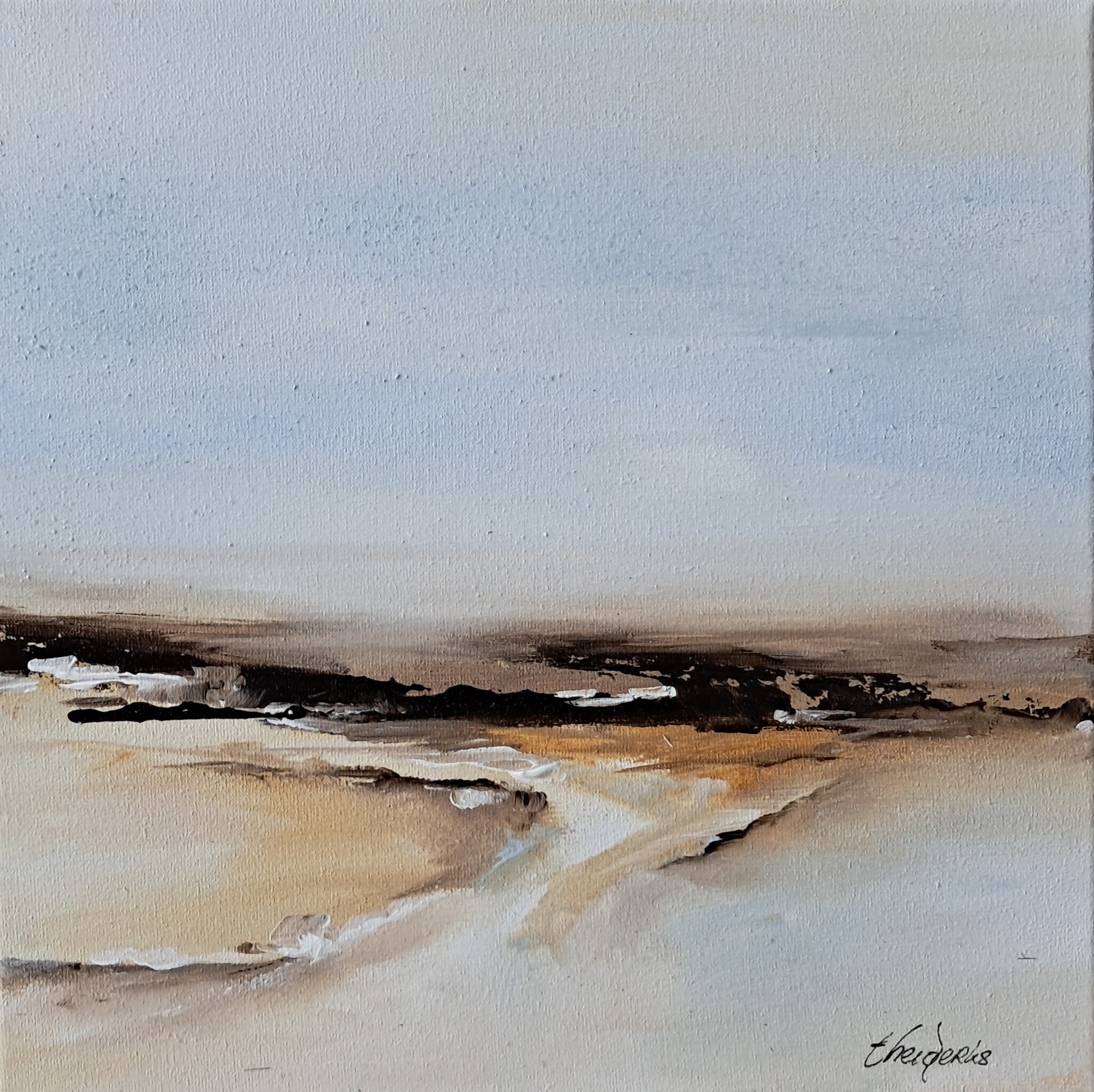 Mixed Media op doek met als basis acryl. 30 x 30 x 2 cm inclusief stalen lijst.
