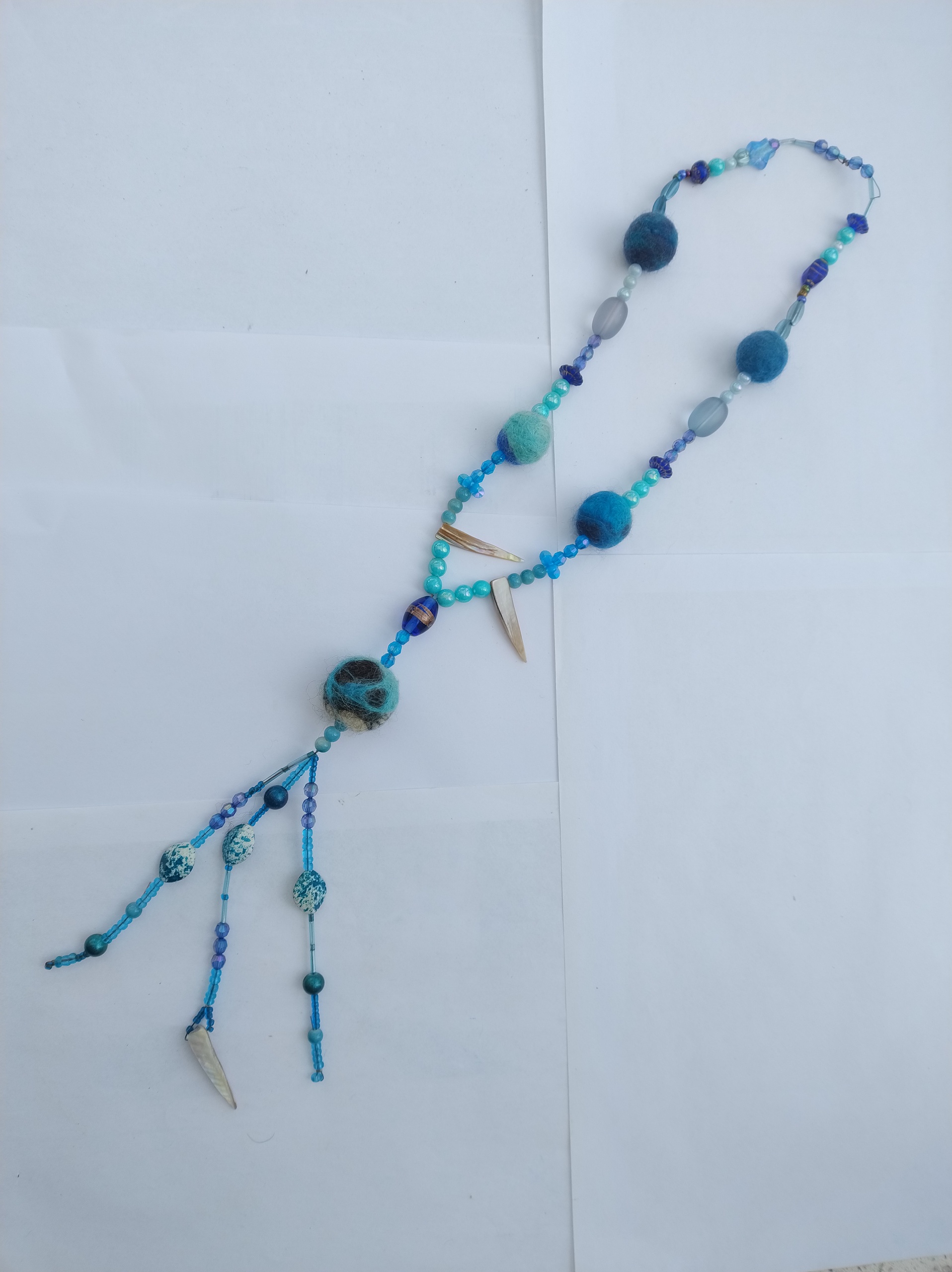 Kralen maken van nat vilt en daarvan met gewone kralen een ketting maken. Kosten €25