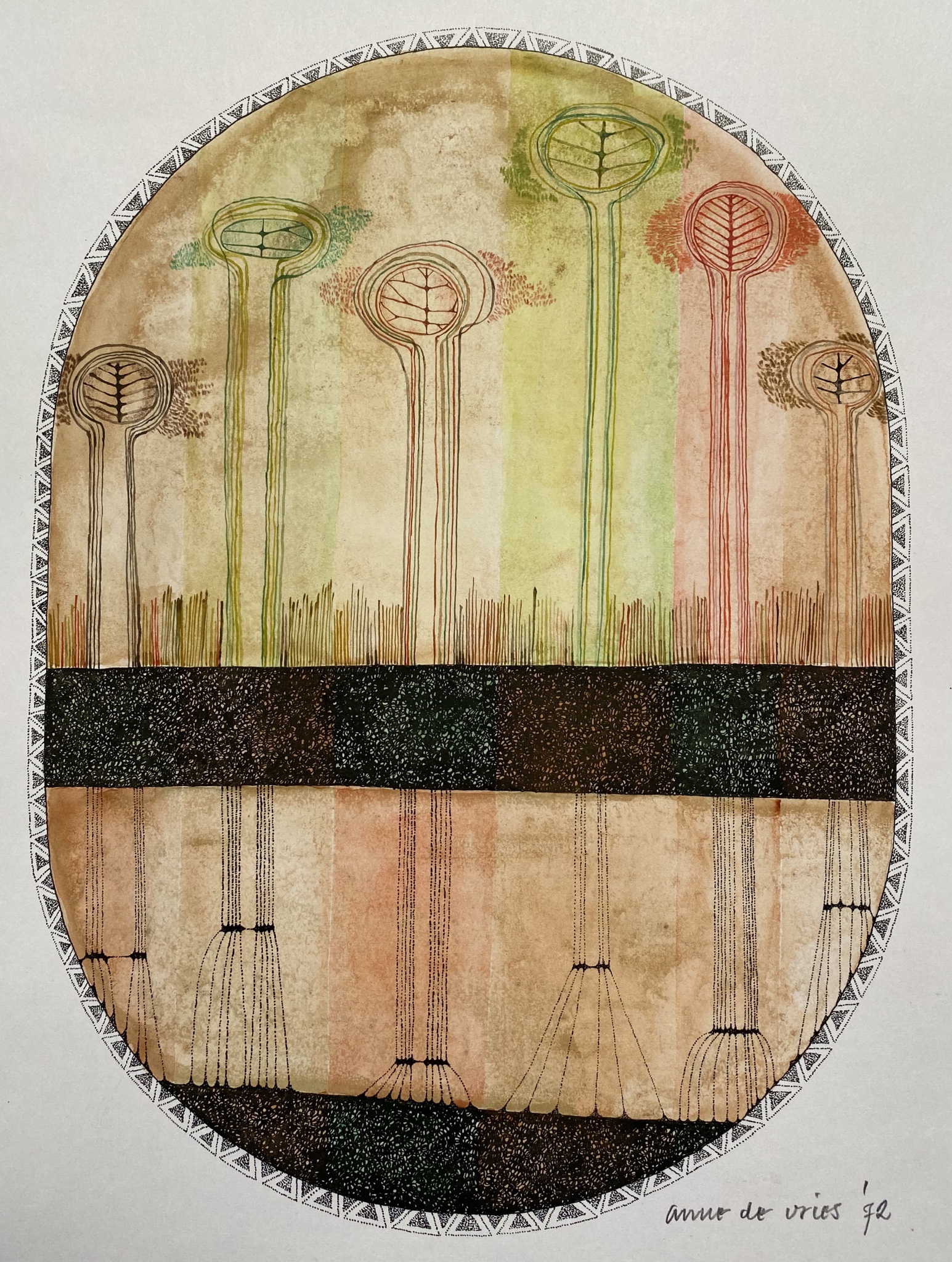Combinatie waterverf en oost-Indische inkt op ivoorkarton. Tekenpen en penseel.