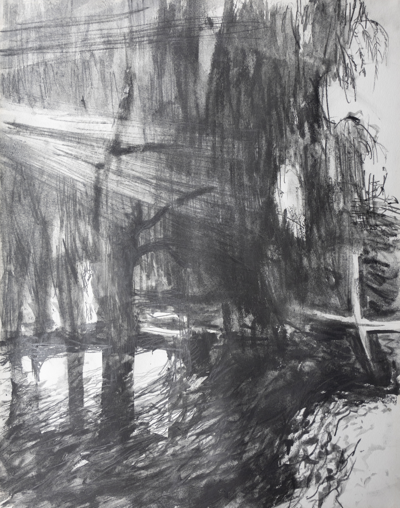 Zon Landschap Water Licht Potlood Tekening Natuur Bomen Zwartwit Grafiet